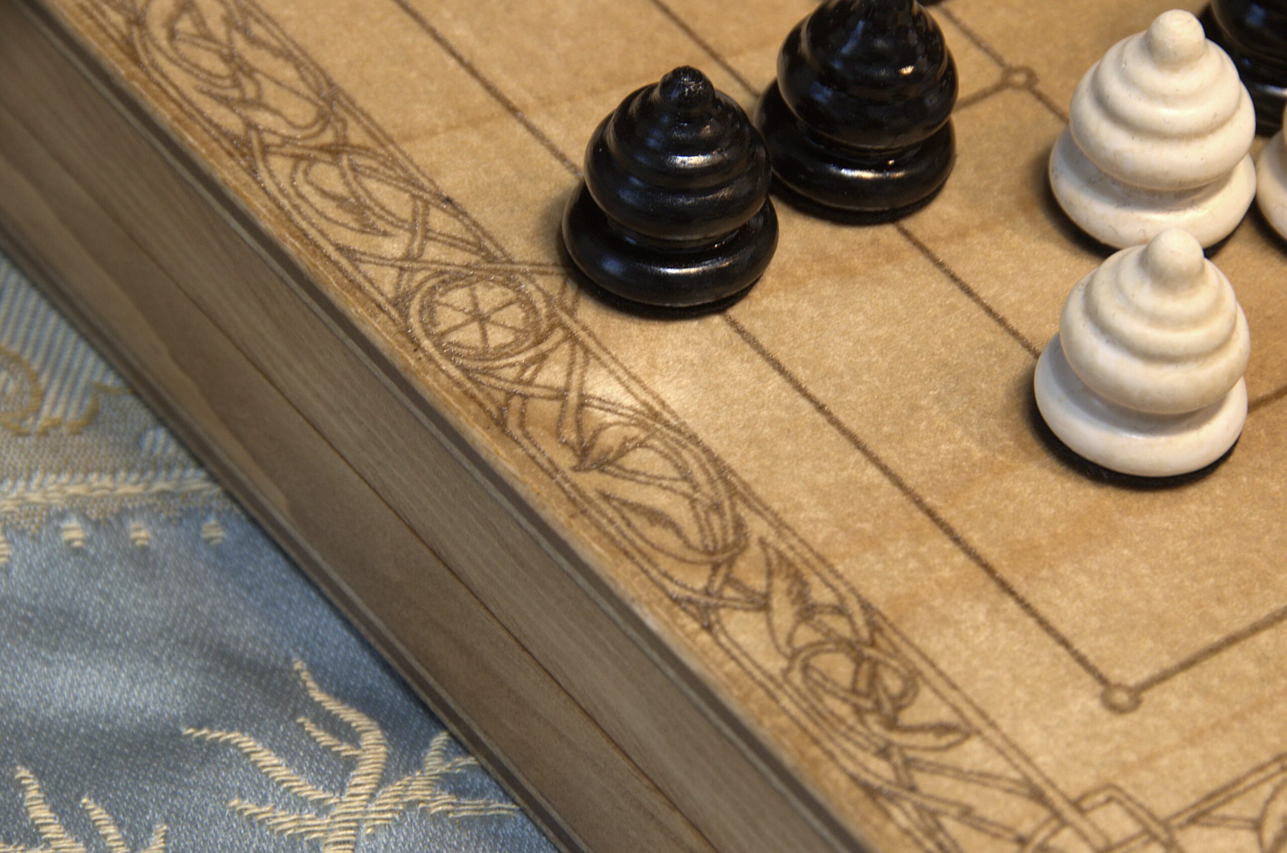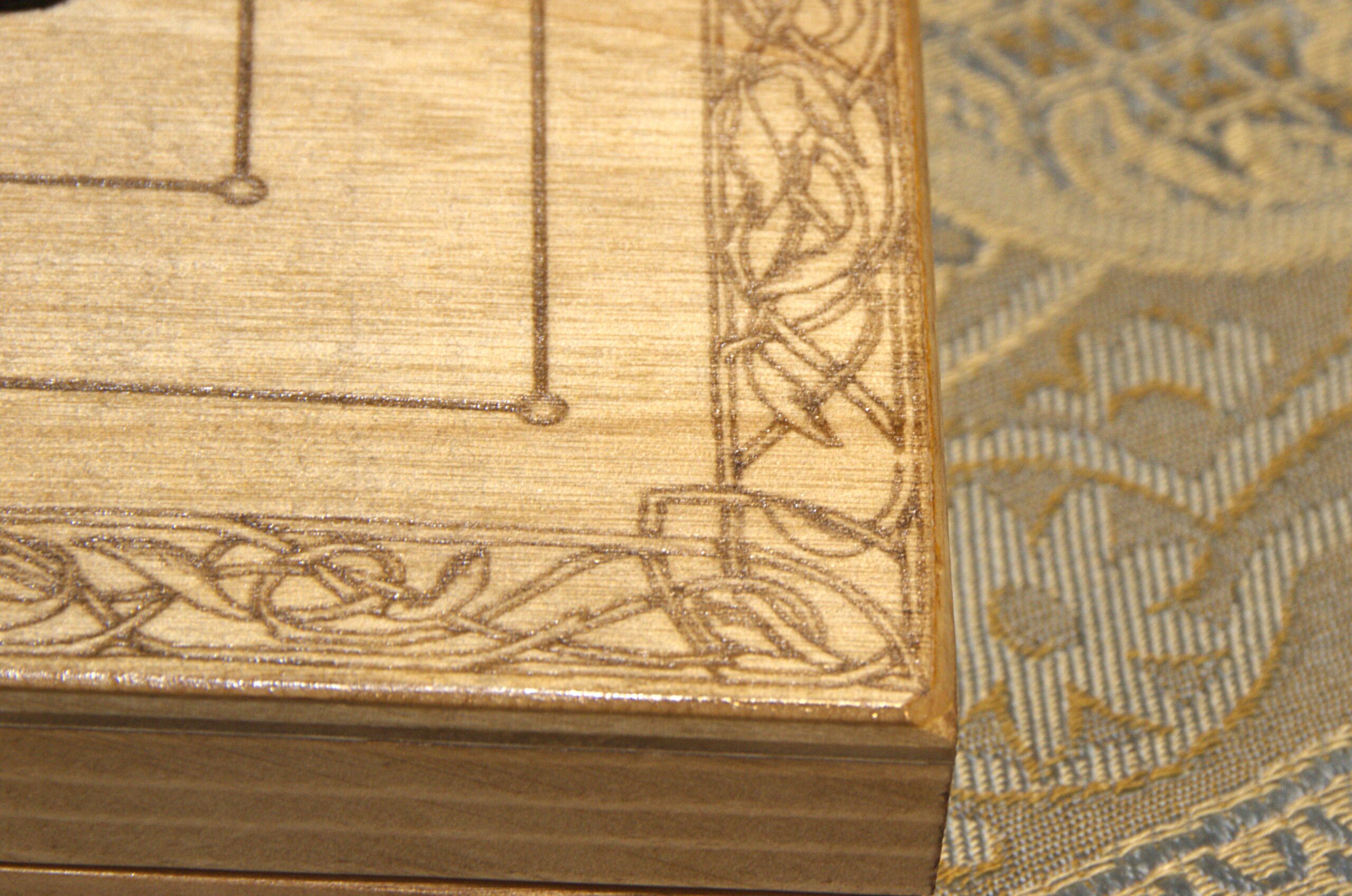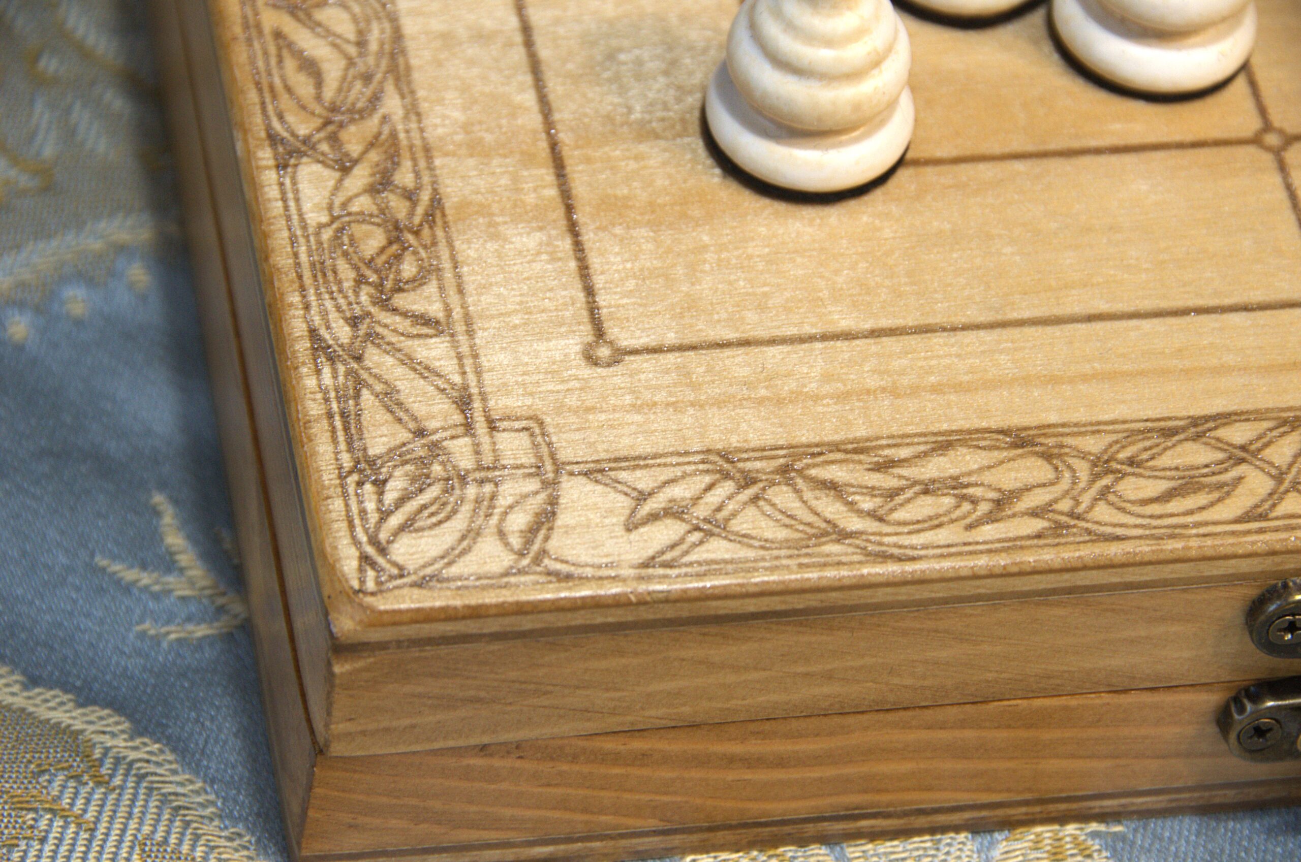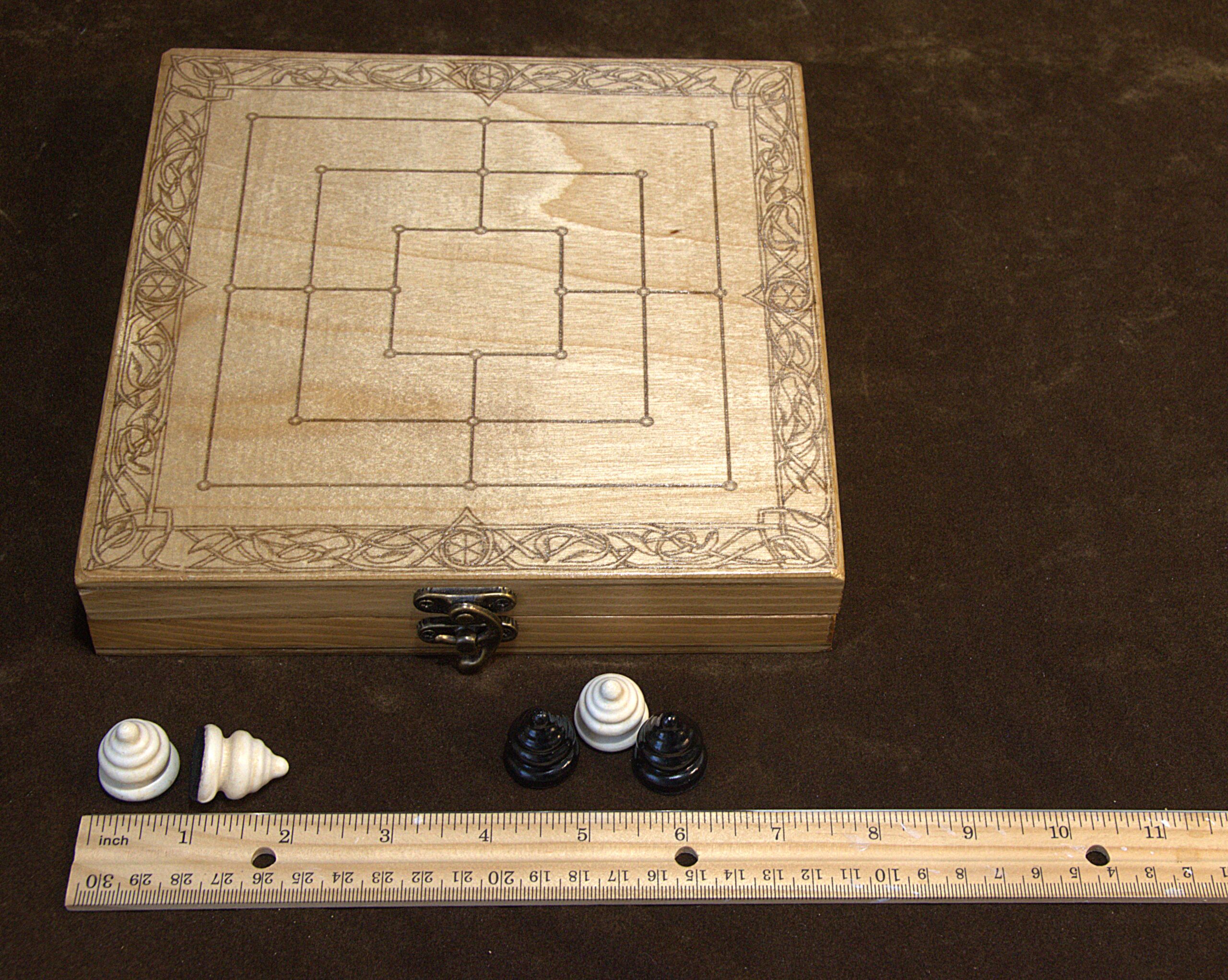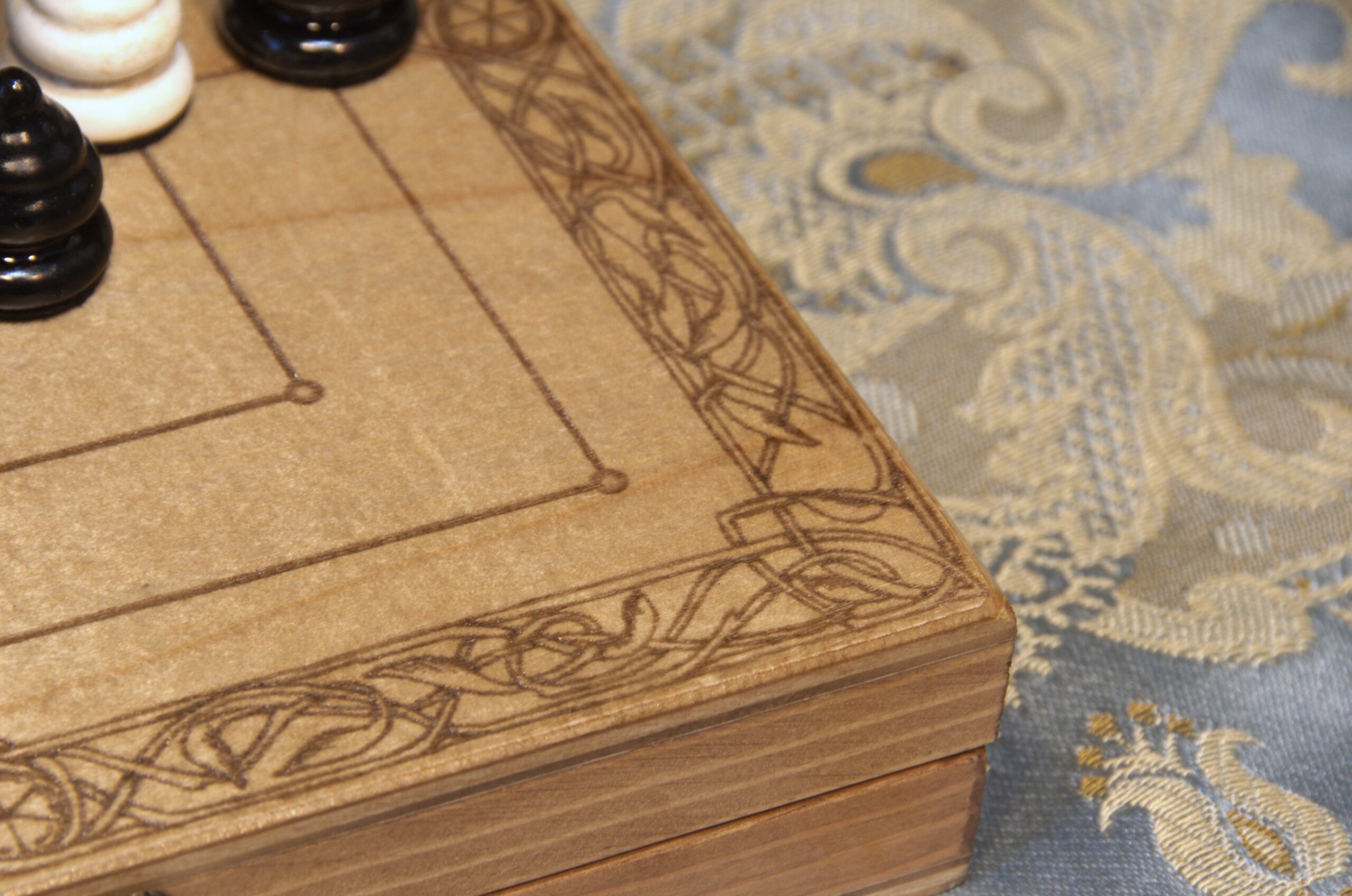 This game board is engraved on the top of a wooden box. The border on the game board is from one of my own original drawings – drawn by hand with pen and ink, then digitized, then laser engraved onto the board. There is space inside to hold all the pieces and the instructions. The inside of the box is lined with velvet.