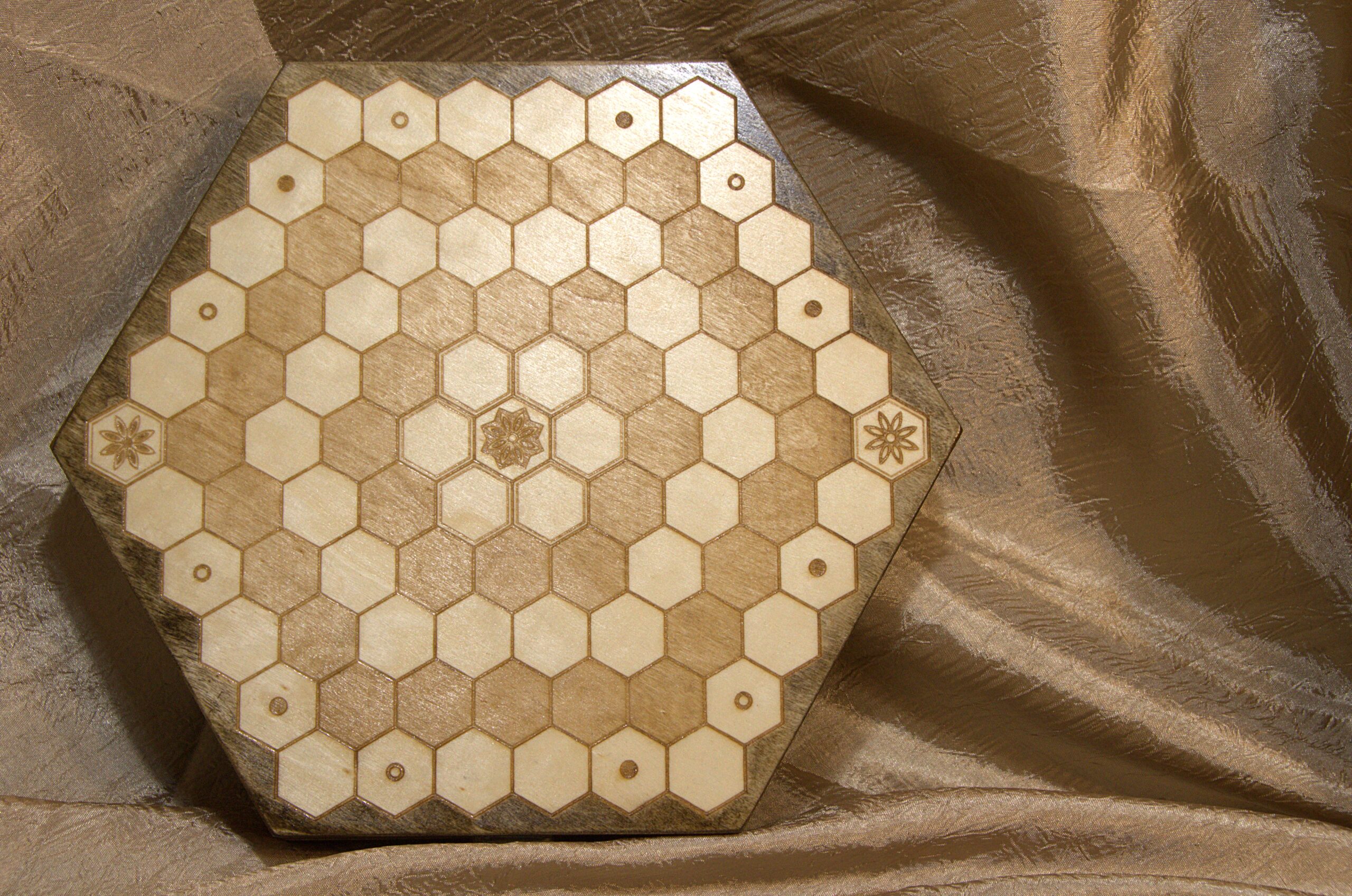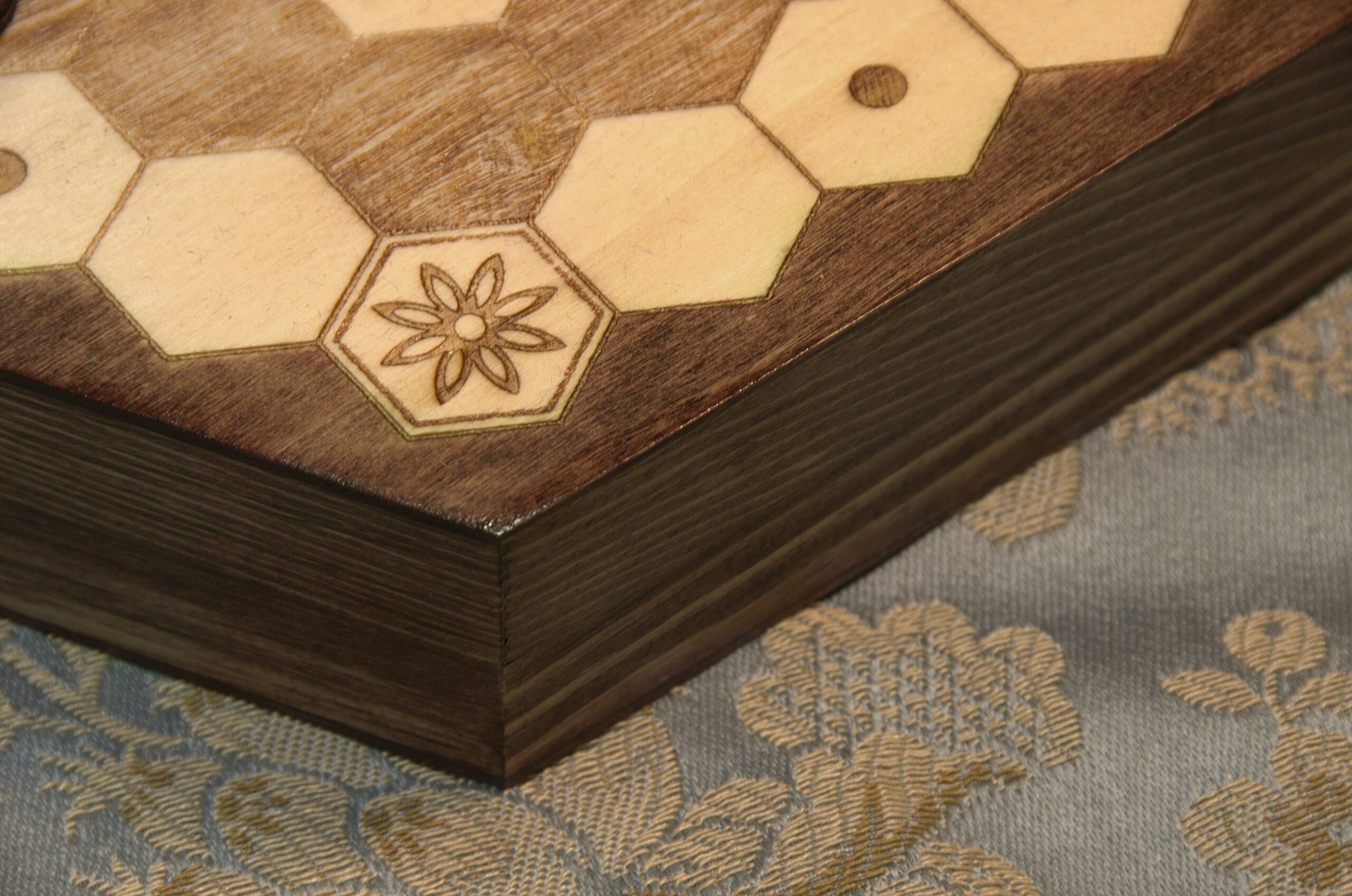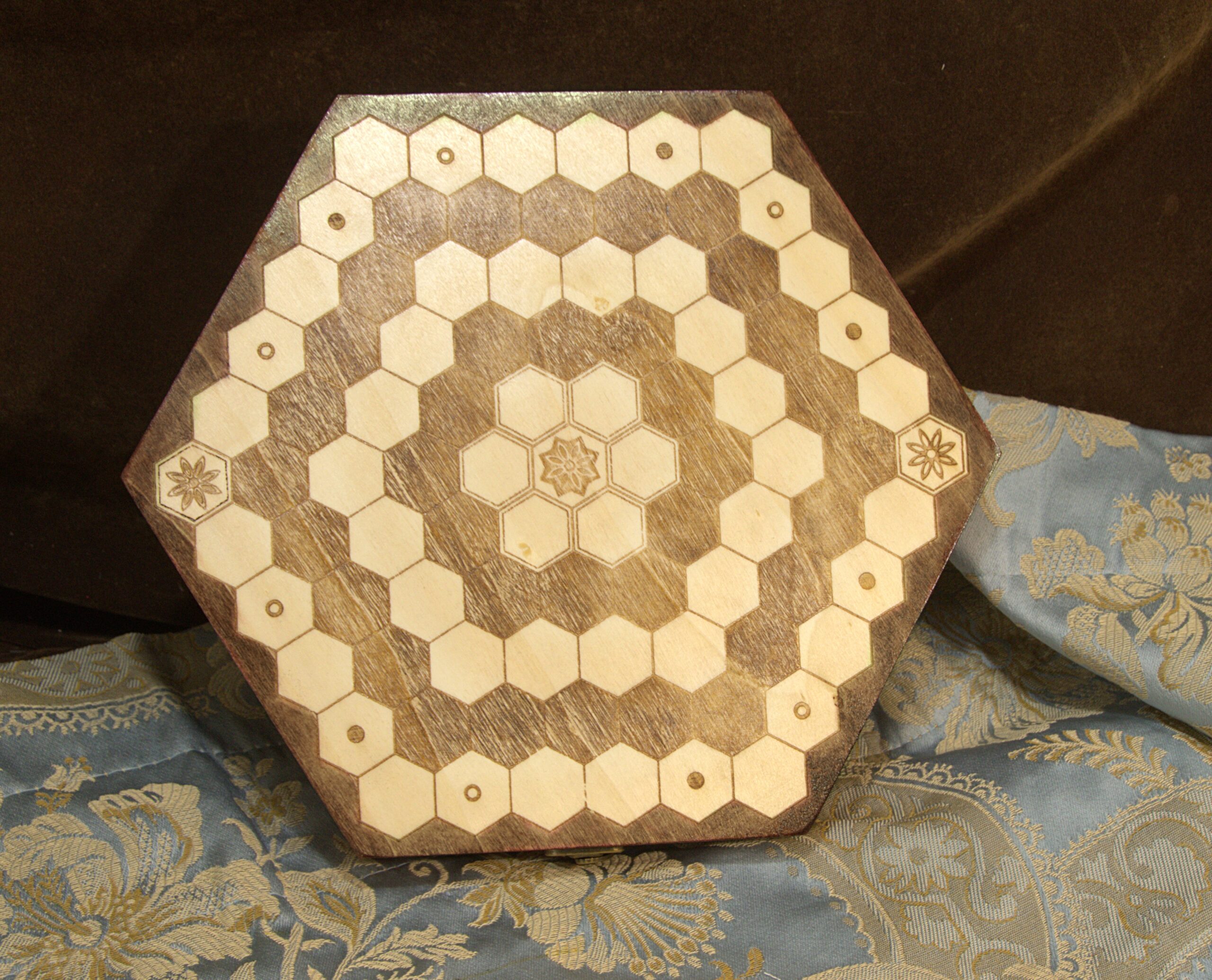 The wooden hexagonal box has the game board engraved onto the top. The inside of the box is lined with dark blue velour.