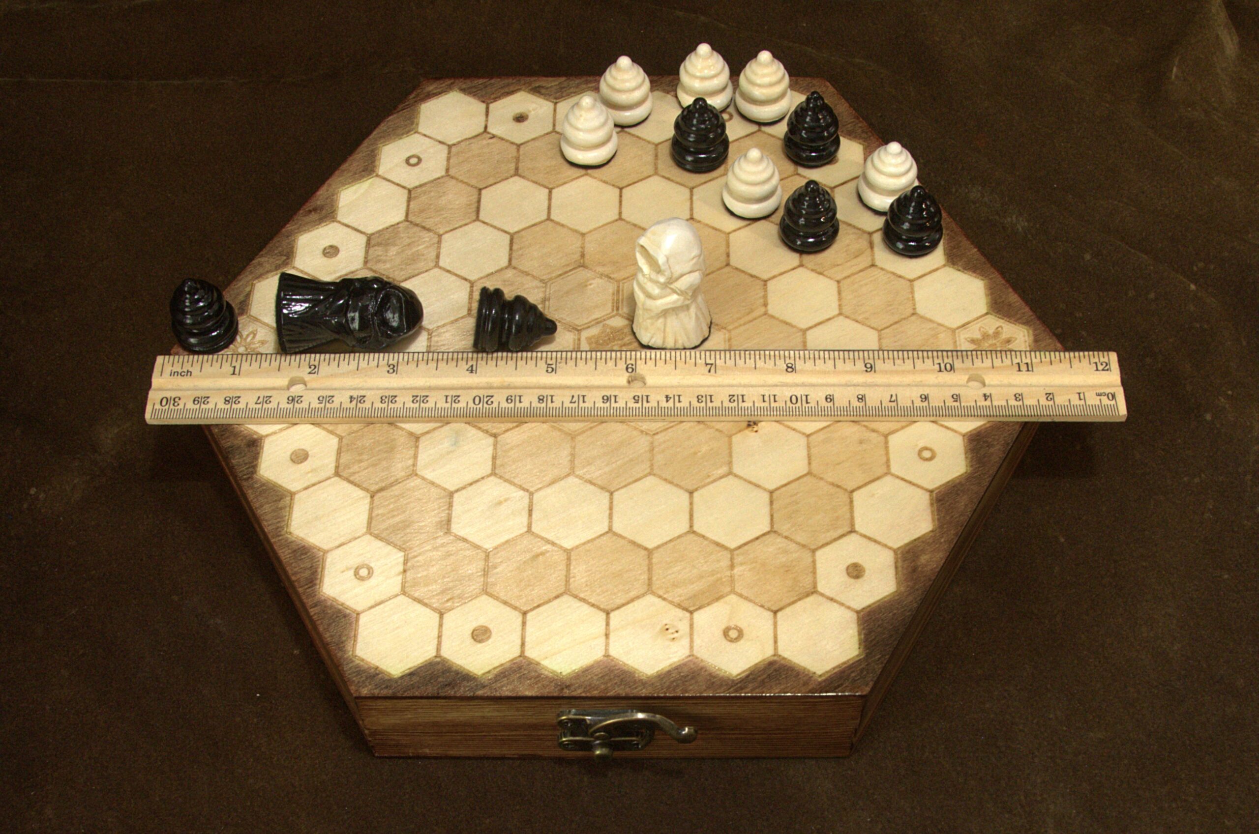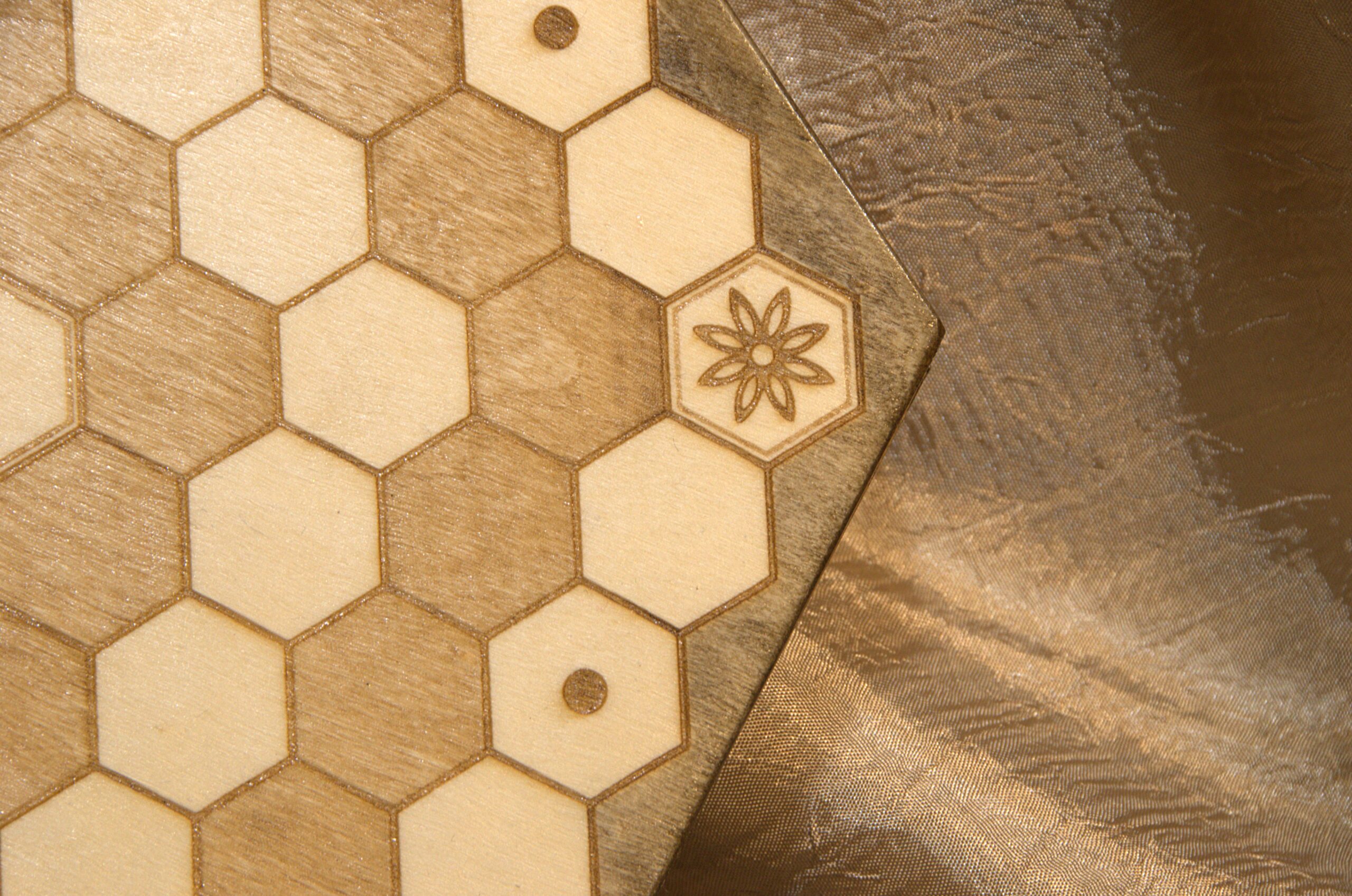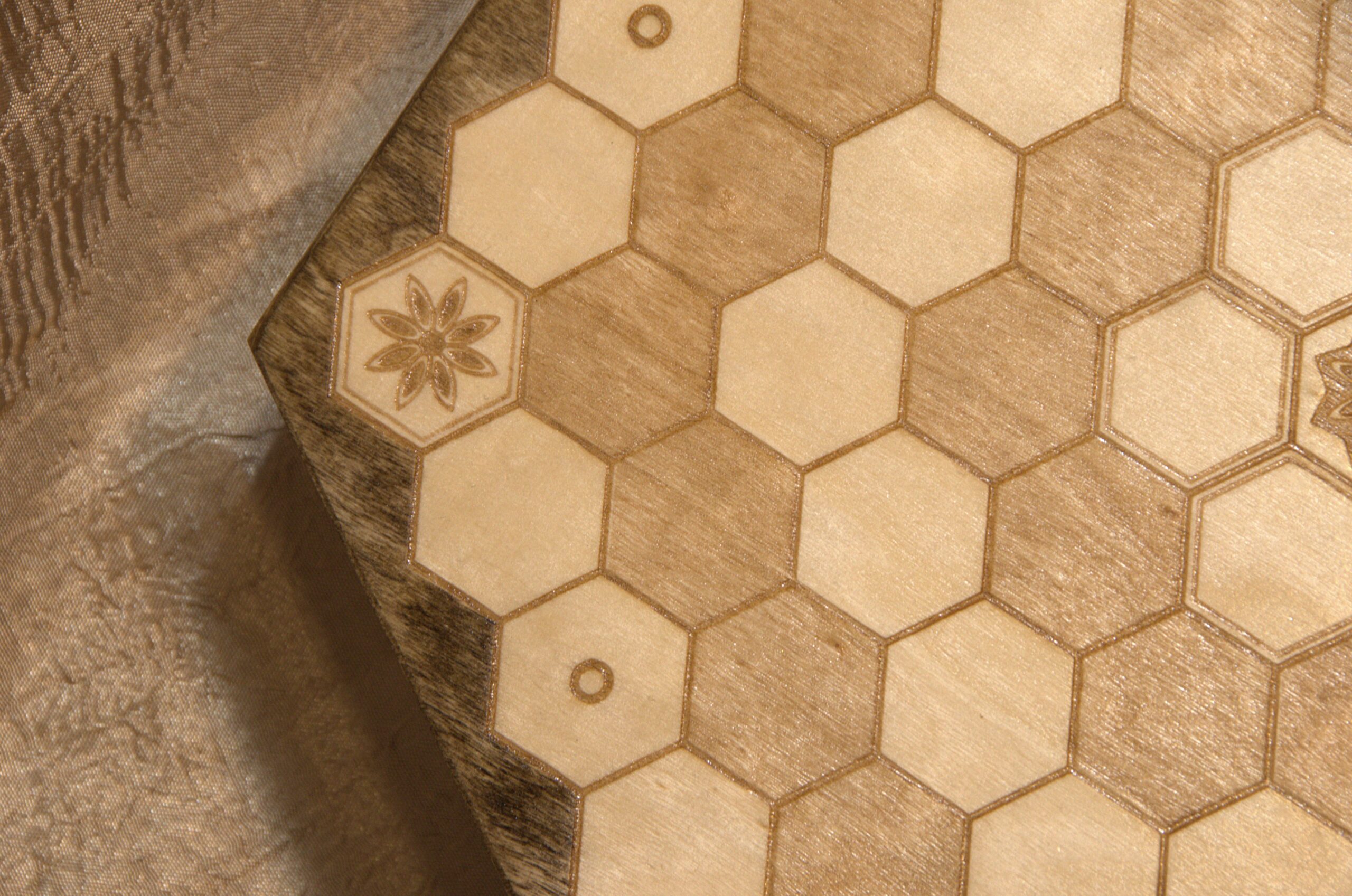 The wooden hexagonal box has the game board engraved onto the top. The inside of the box is lined with dark blue velour.