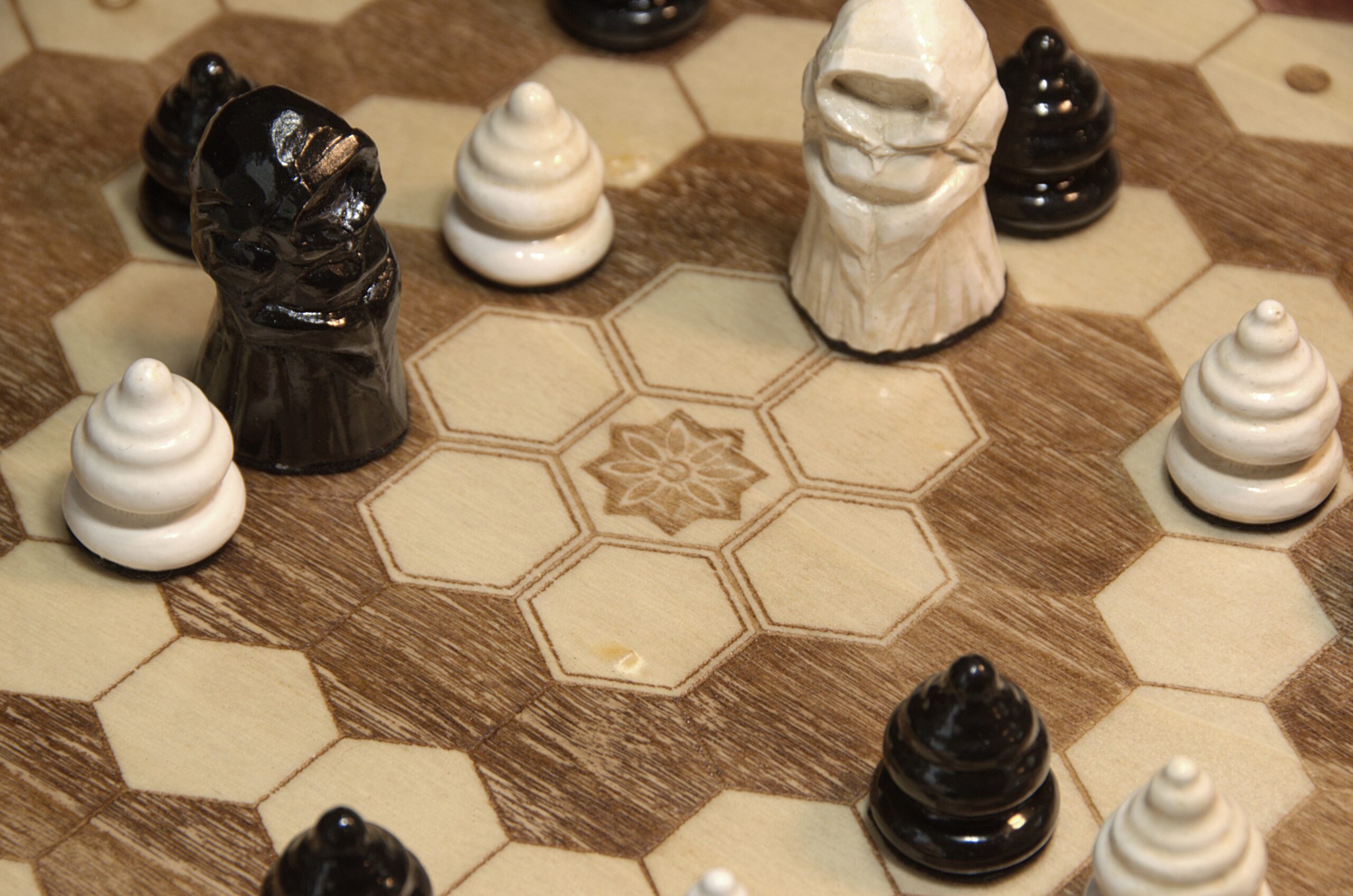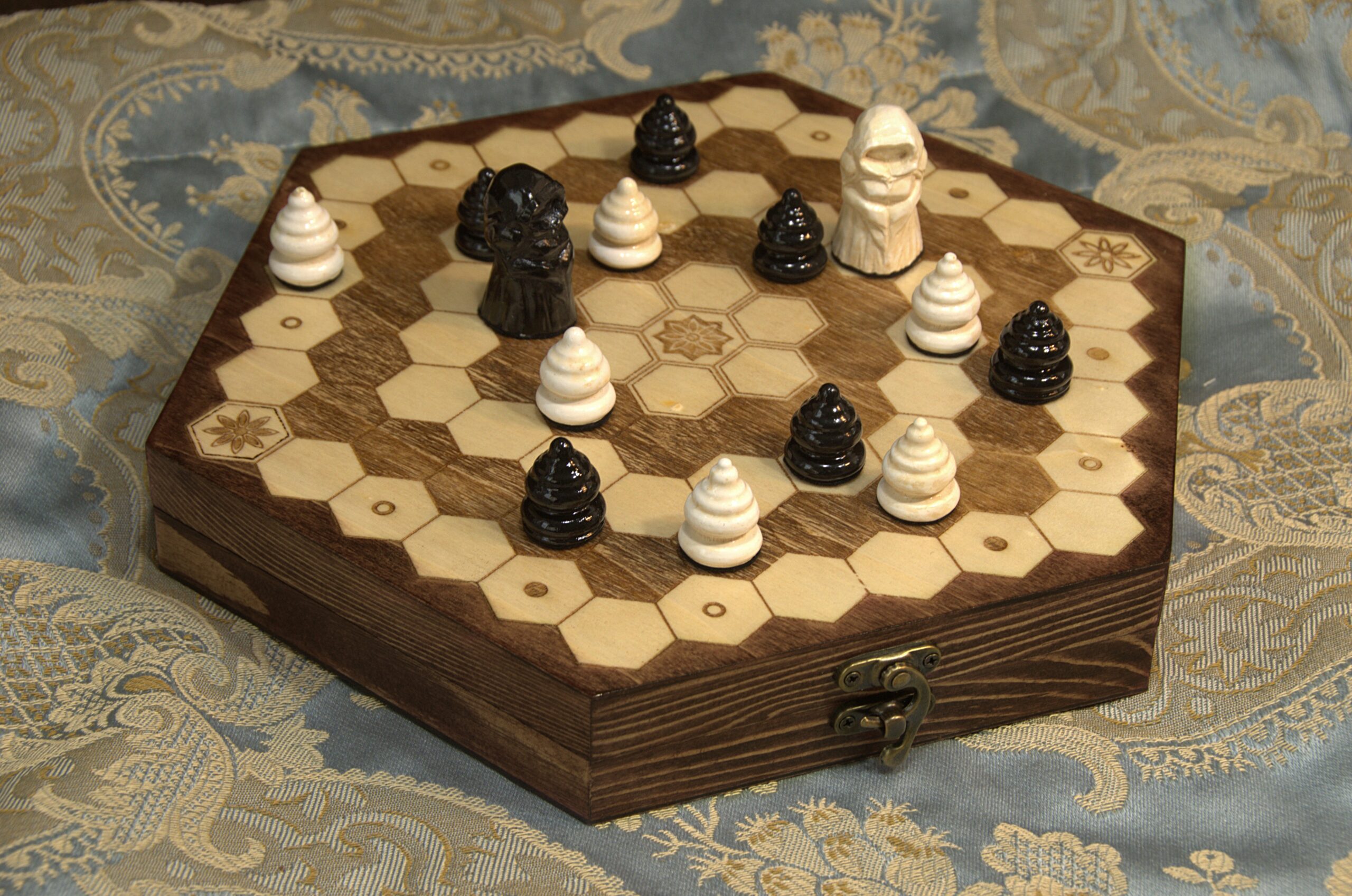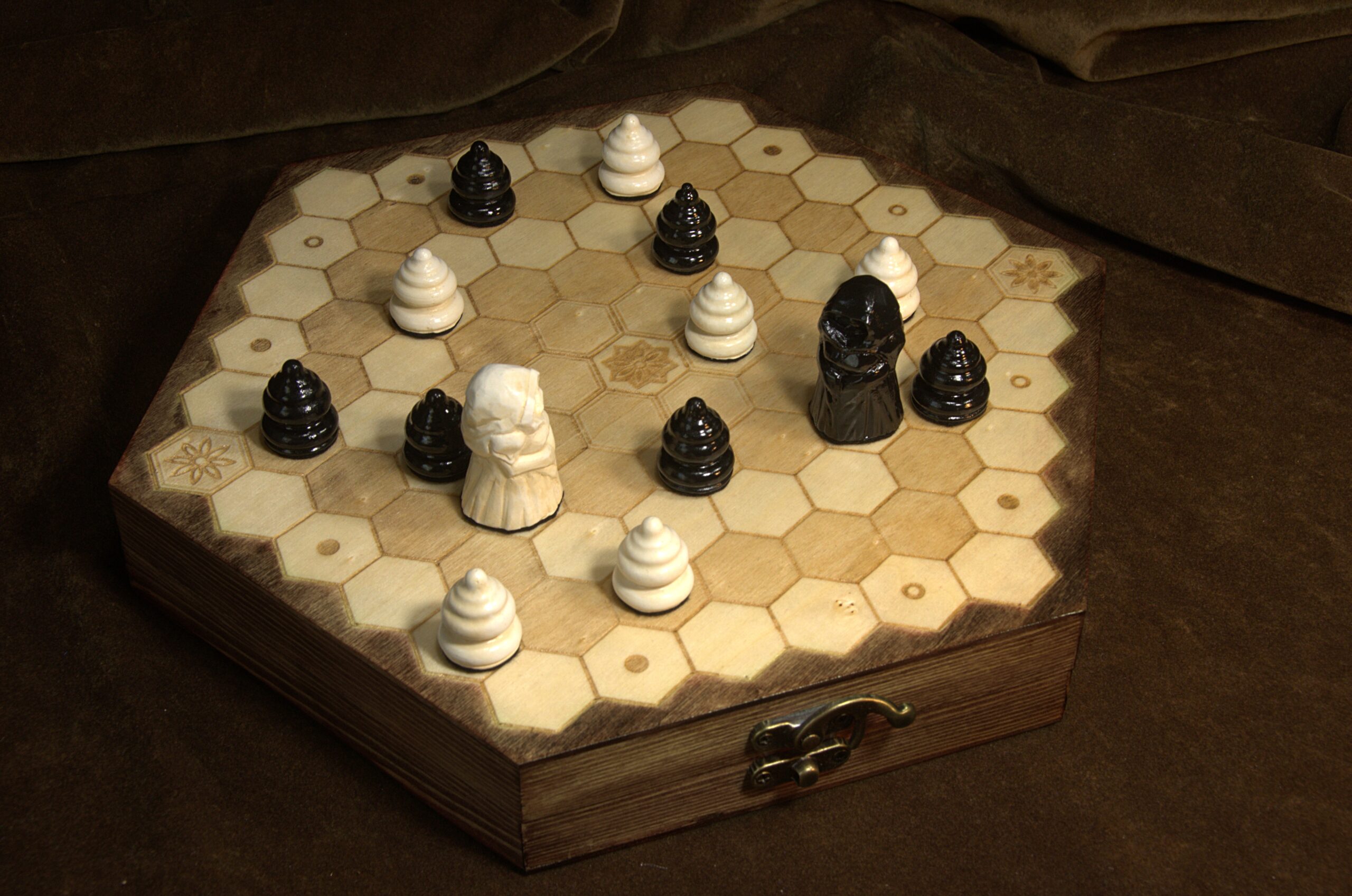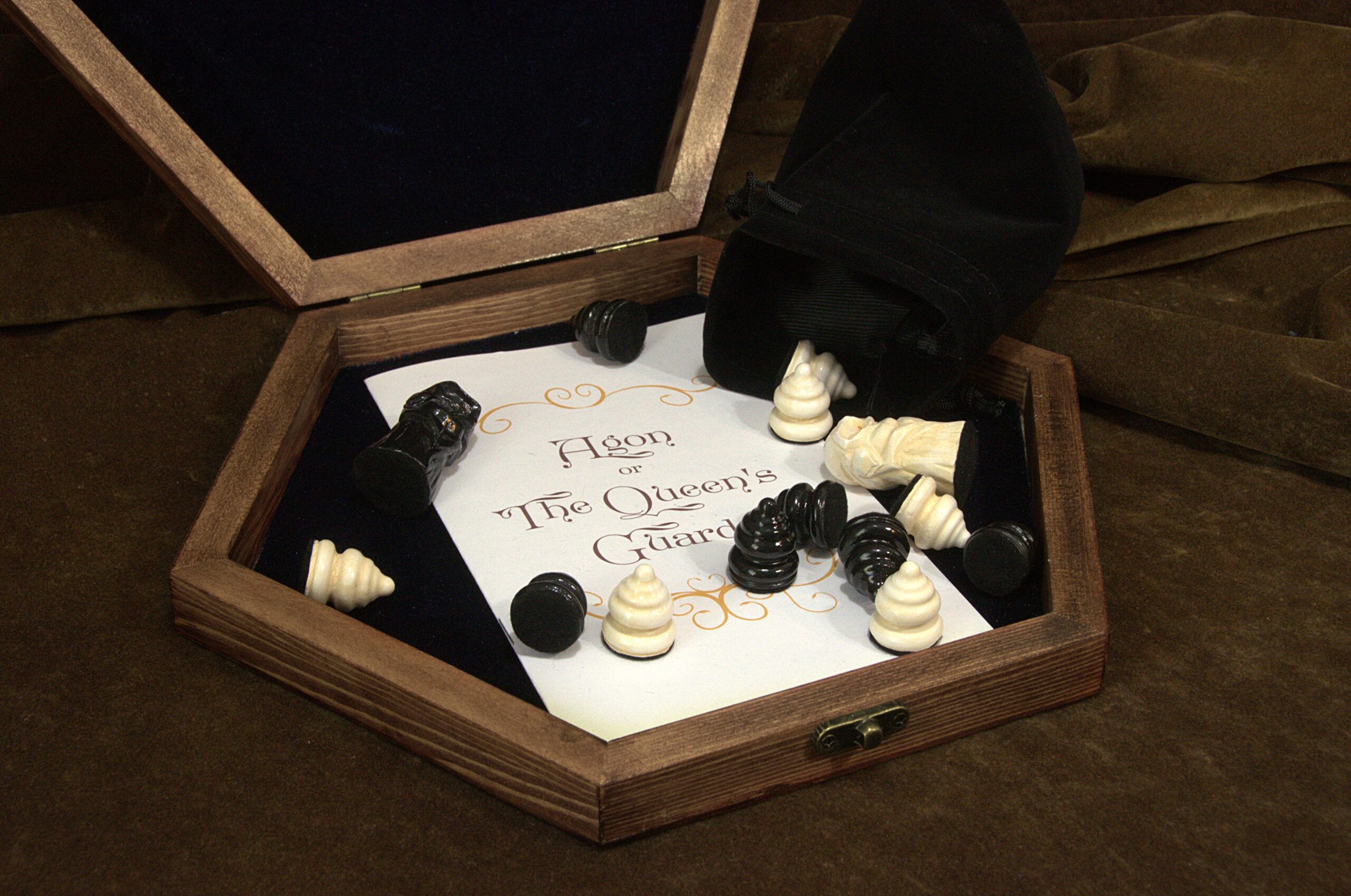 “Queen’s Guards” (also known as “Agon” or “Royal Guards”) is an engaging two player strategy game. It’s often called a “Chess Variant”, however the game mechanics are very different from chess, as the goal is not to capture the enemy, but to reach the center of the board. This game was invented during the Victorian era and may be the oldest known 2 player hexagonal board game.