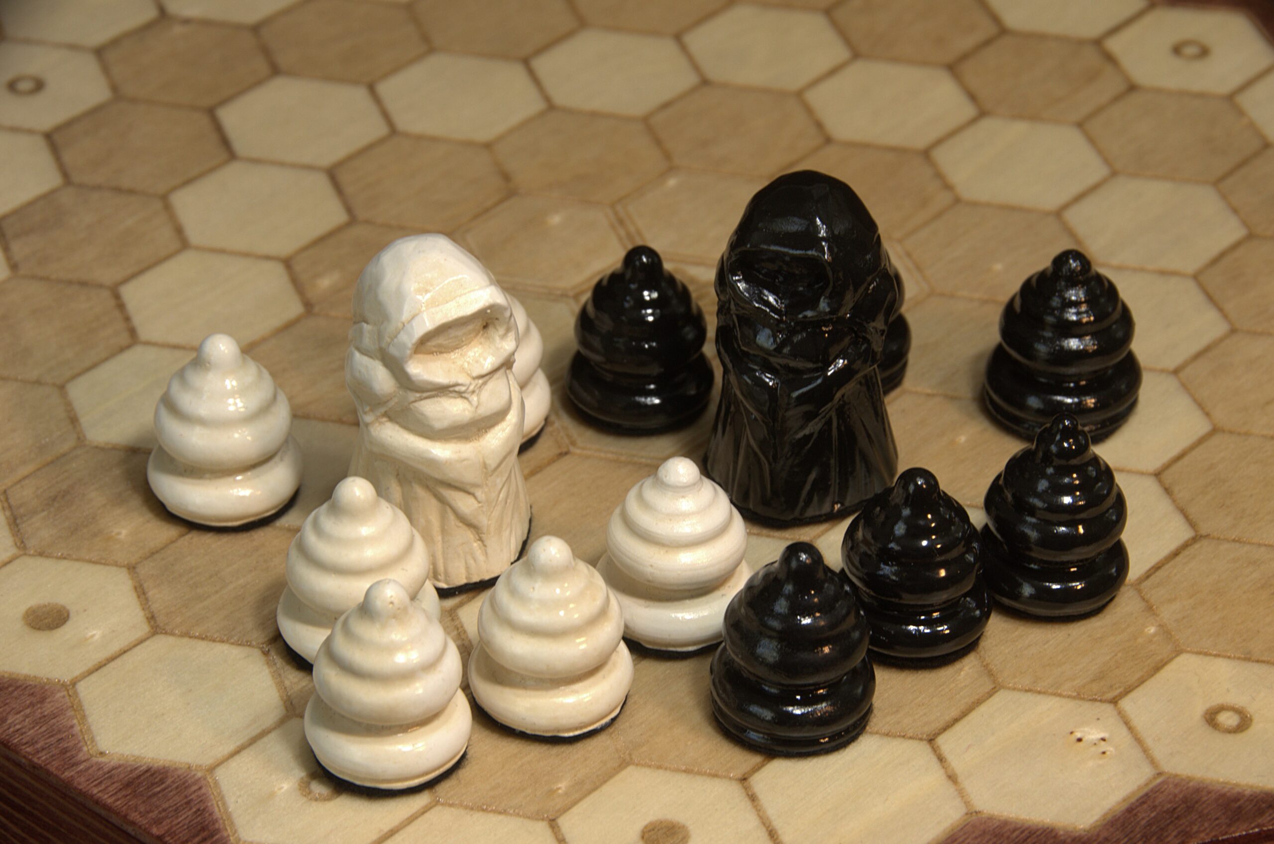 The game pieces were cast from gypsum cement – a material which has been used since ancient times. The type that I use has a strength similar to concrete, but with a smooth white texture that makes it easier to paint. The “Queen” piece is a cast copy of an original sculpture that I carved by hand. The game also comes with an instruction booklet and a velvet pouch that holds the pieces securely inside the box.