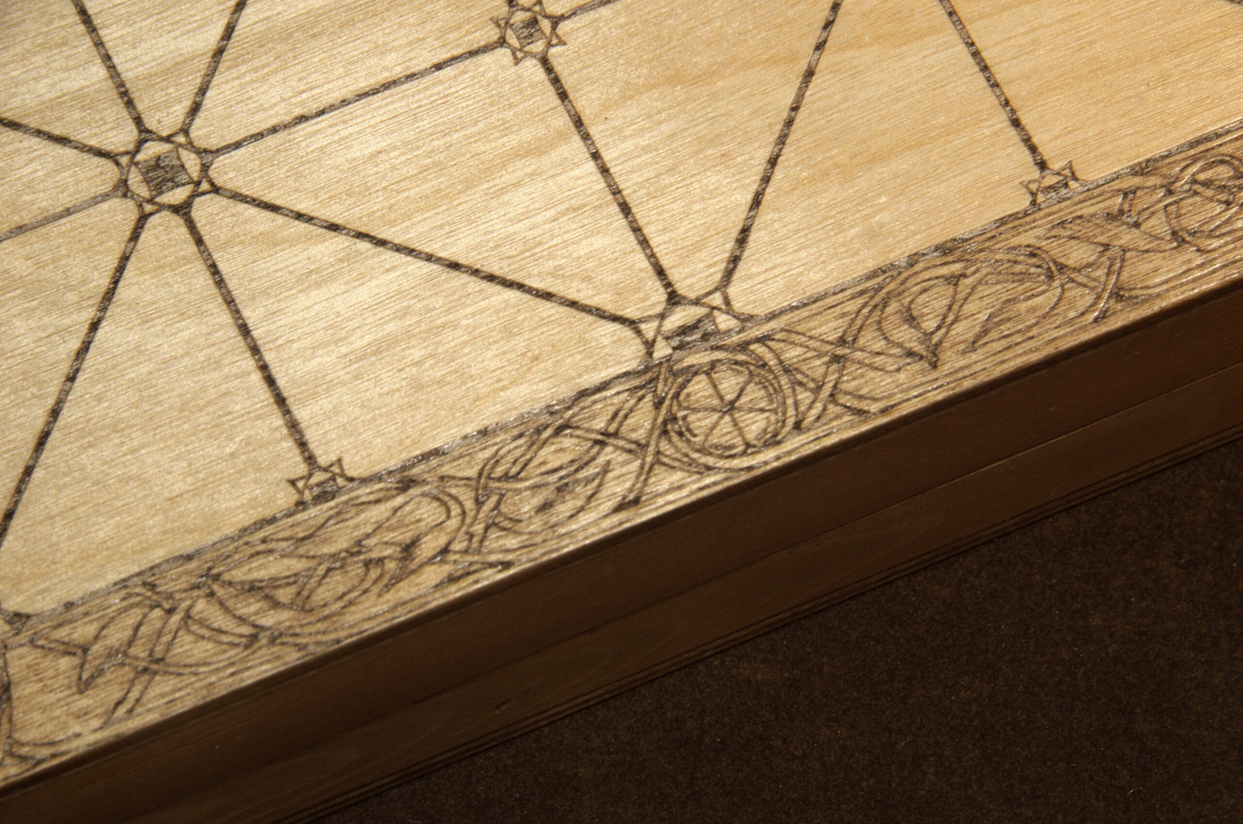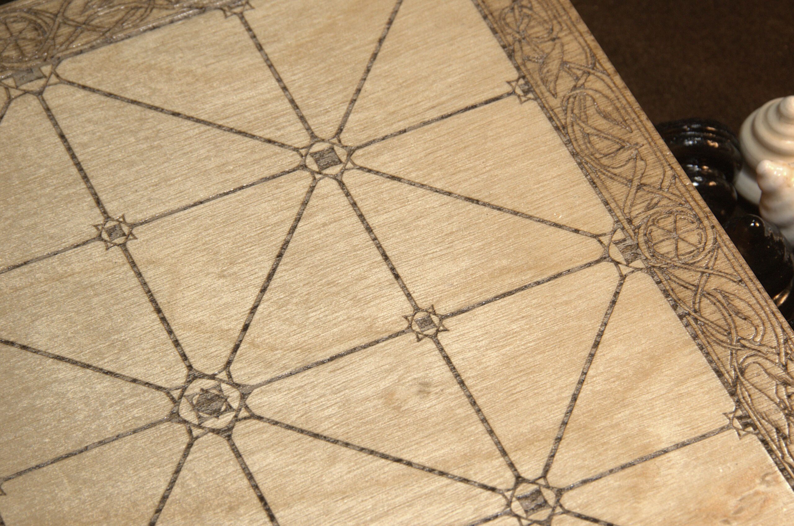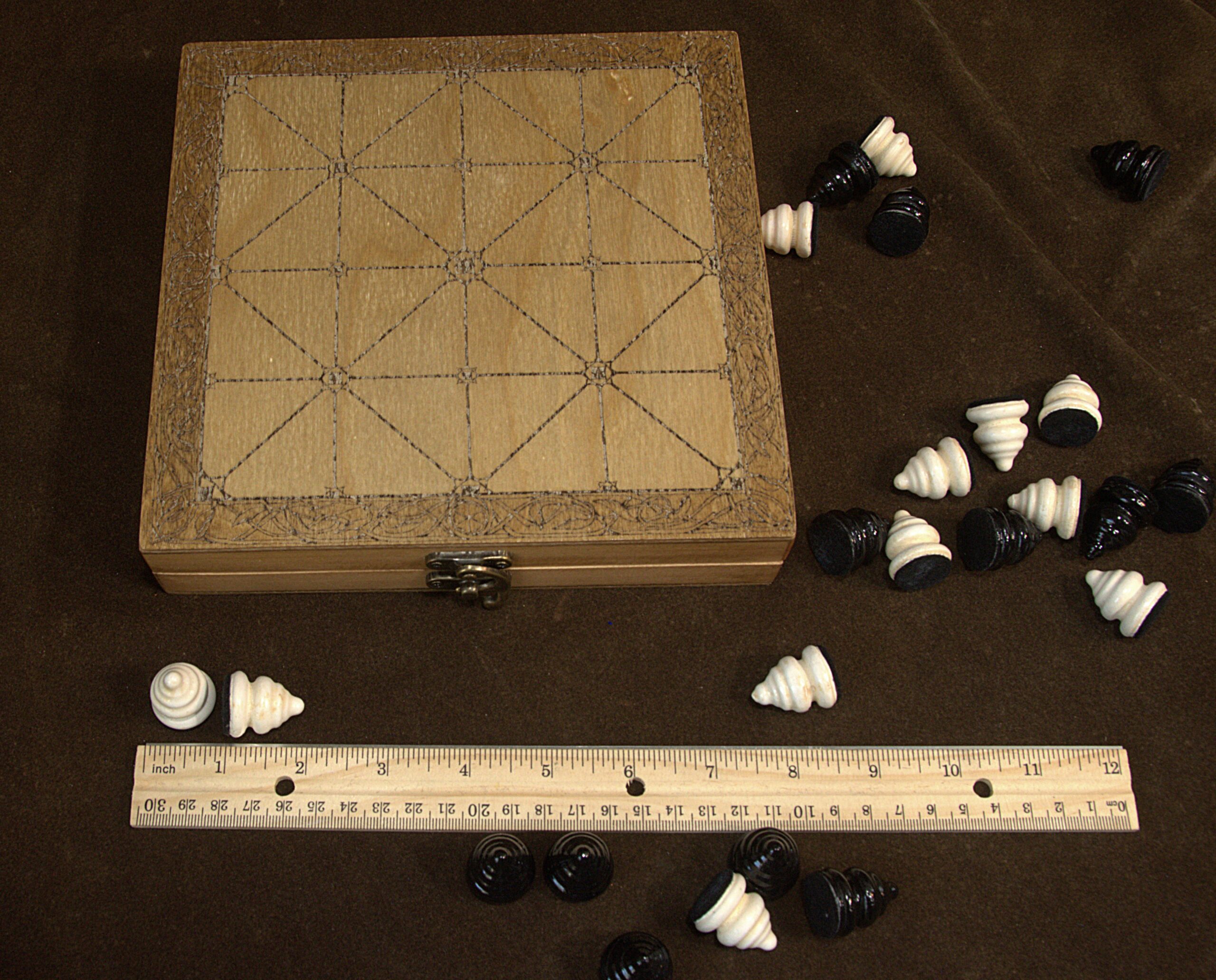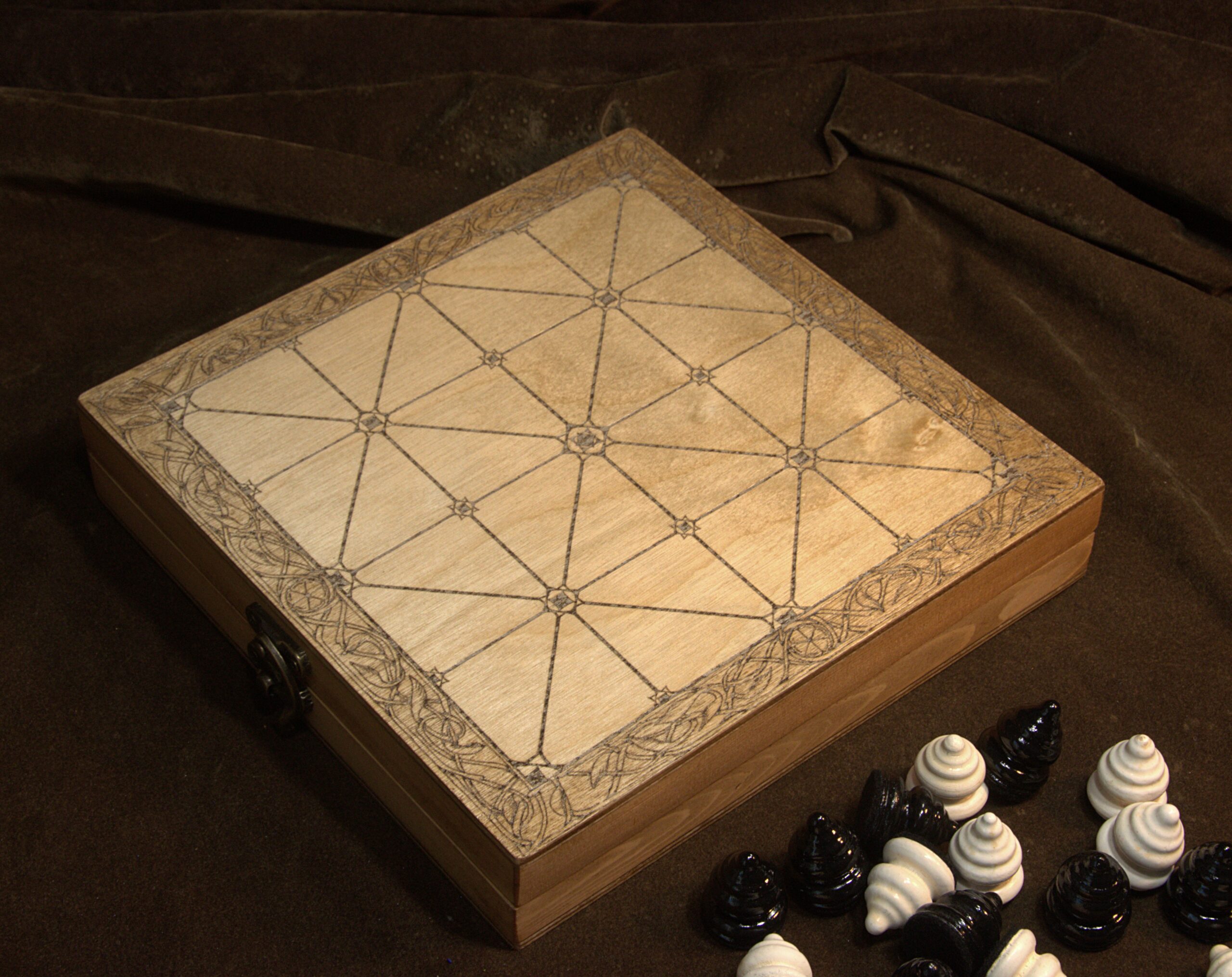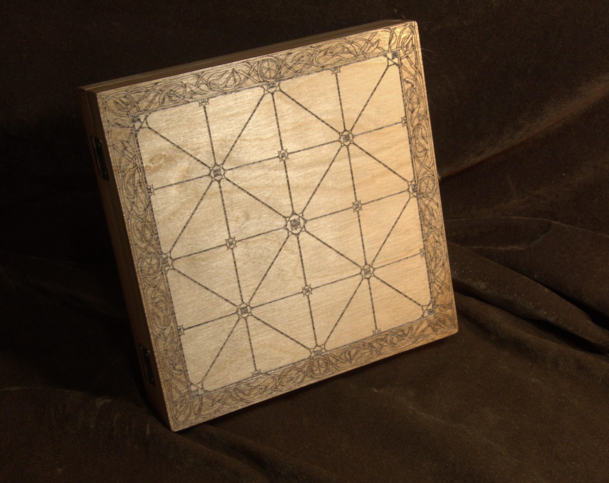 This game set is a wooden box with the game board engraved on the top of the box. The border on the game board is from one of my own original drawings – drawn by hand with pen and ink, then digitized, then laser engraved onto the board. There is space inside to hold all the pieces and the instructions. The inside of the box is lined with velvet.
