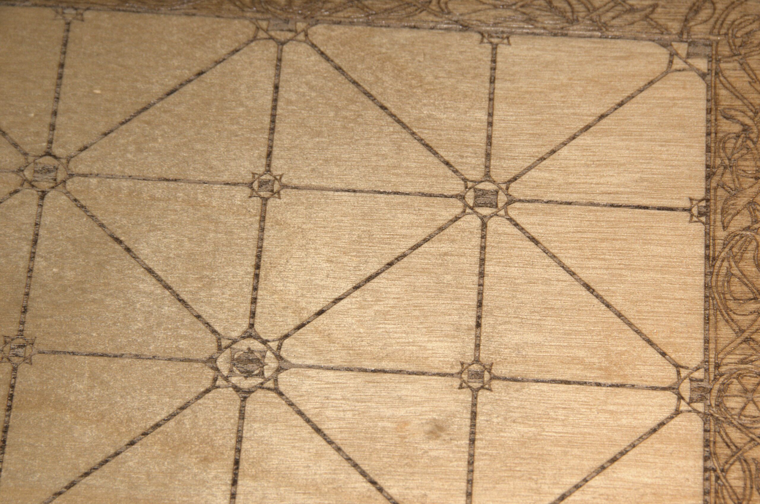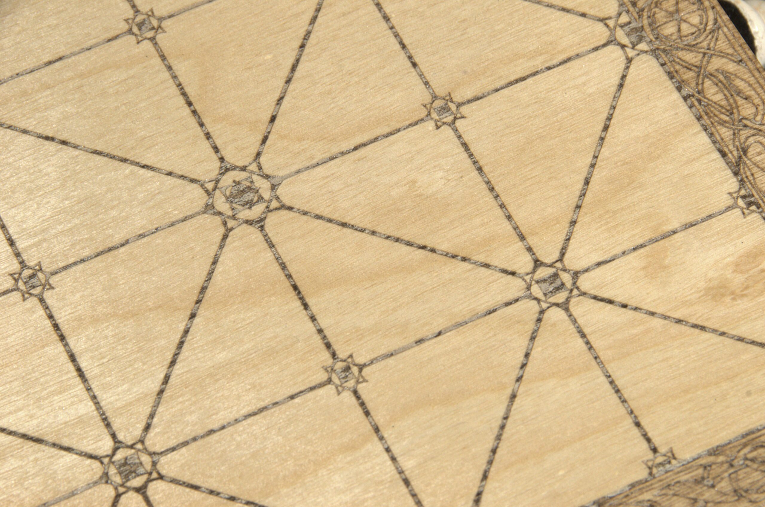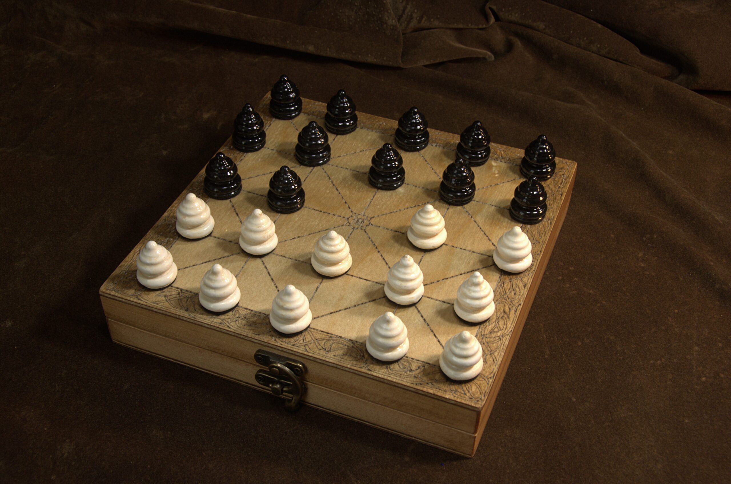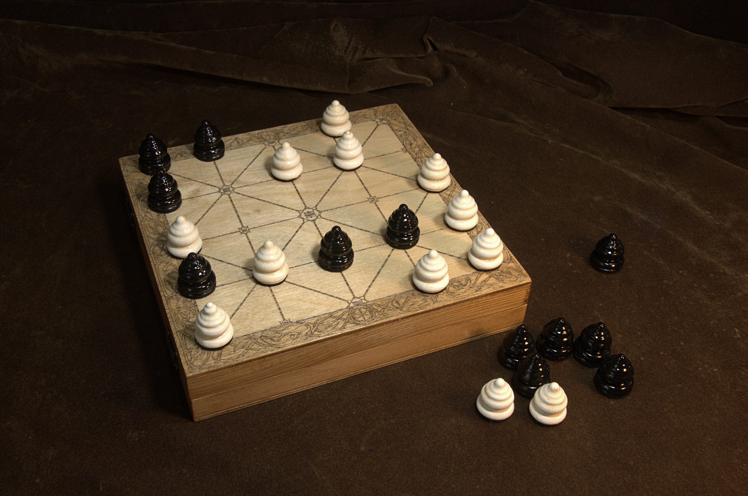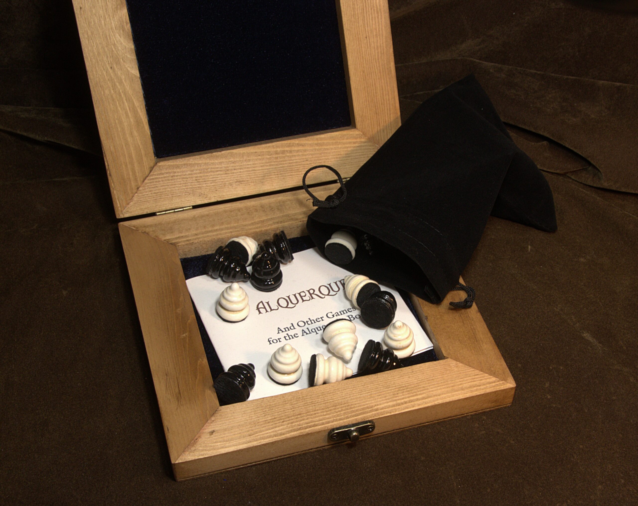 This game set is a wooden box with the game board engraved on the top of the box. The border on the game board is from one of my own original drawings – drawn by hand with pen and ink, then digitized, then laser engraved onto the board. There is space inside to hold all the pieces and the instructions. The inside of the box is lined with velvet.