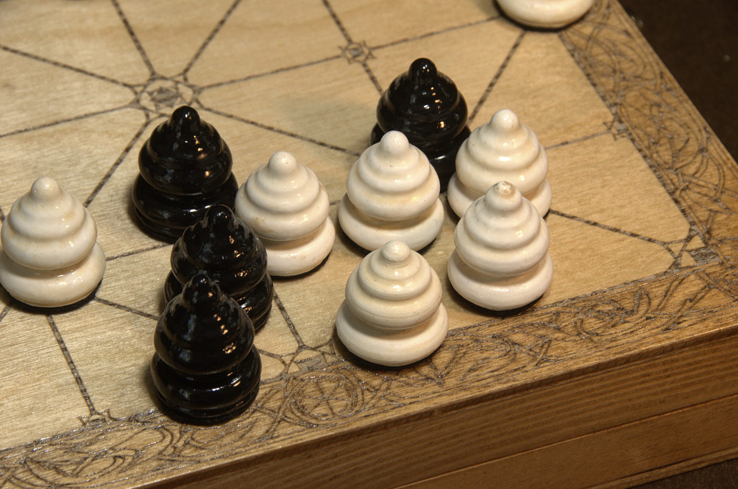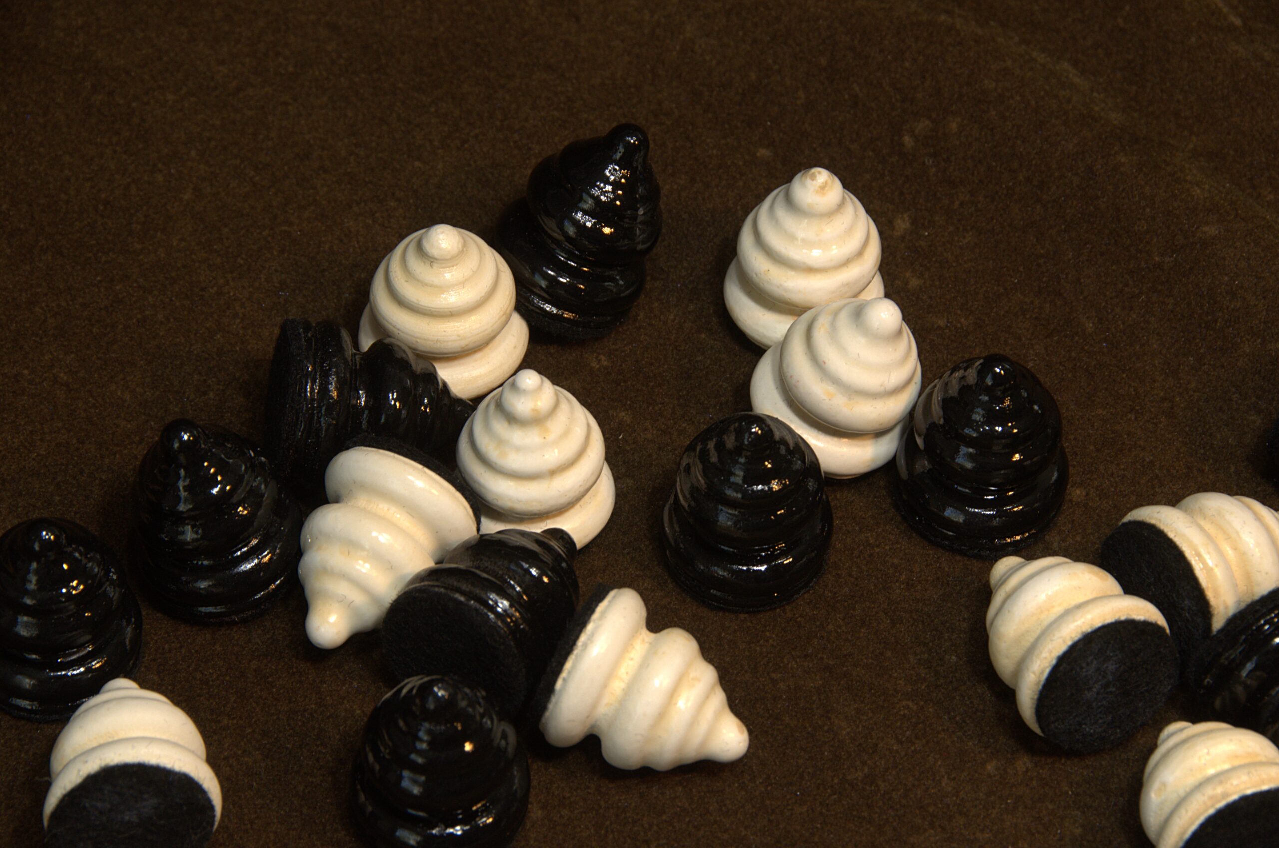 The black and white game pieces are made from gypsum. Each game piece is a copy of an original piece that I made on a pottery wheel. They are hand cast with gypsum cement – a smooth plaster-like material that has a strength similar to concrete. This material has been in use for thousands of years.