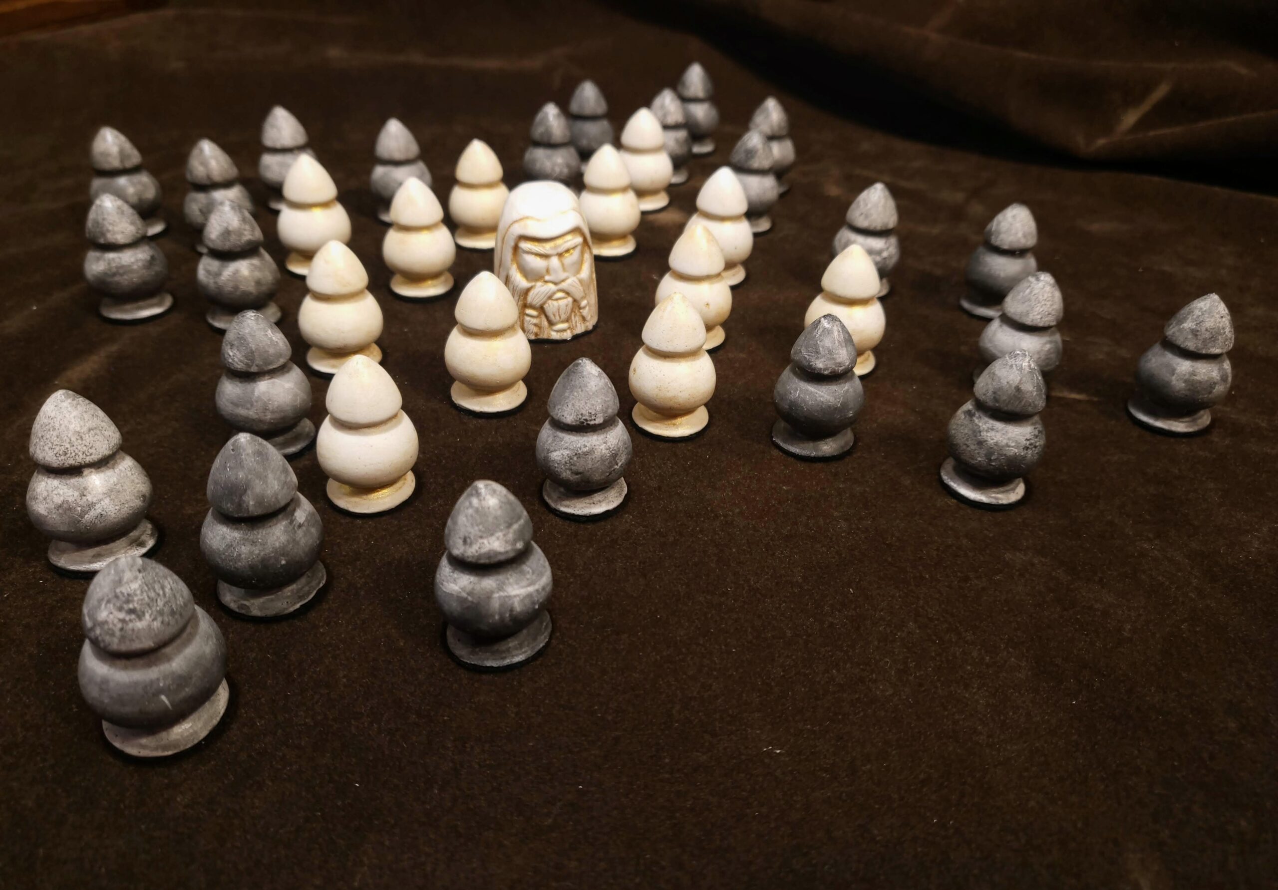 The game pieces were cast from gypsum cement, a material that has been in use for thousands of years. They have a similar strength to concrete, a smooth stone-like feel, and a satisfying “clack” sound when they tap against each other. The bottoms of the pieces are lined with felt to protect the game board and allow the pieces to slide smoothly across the board.