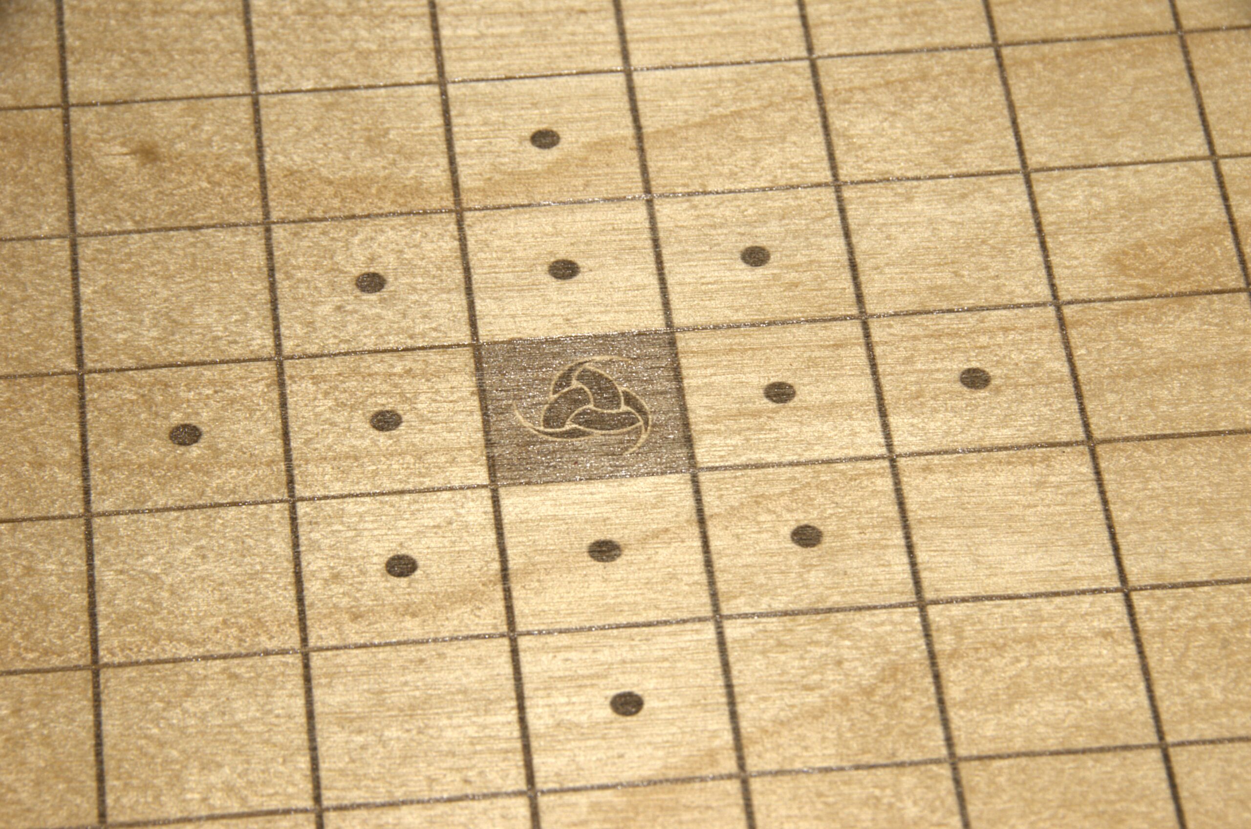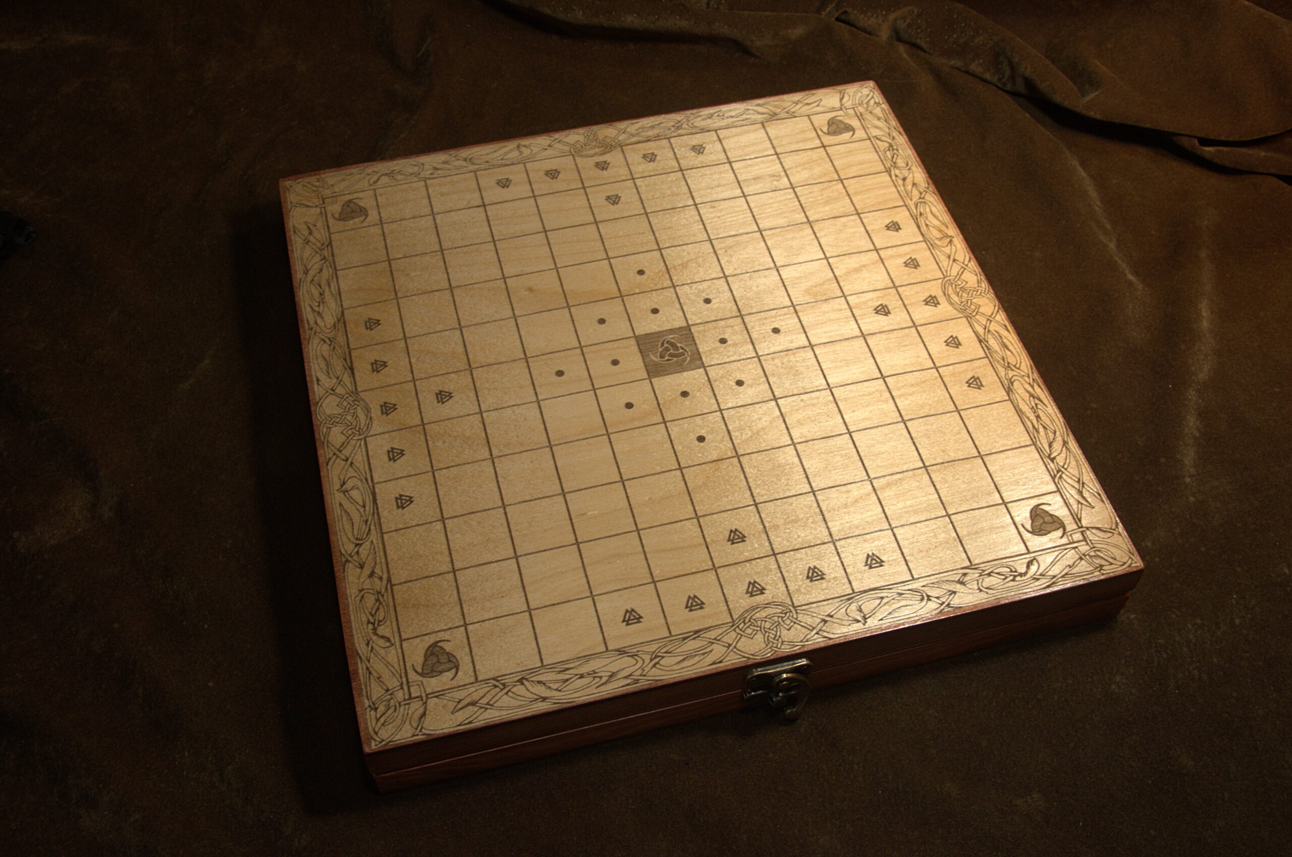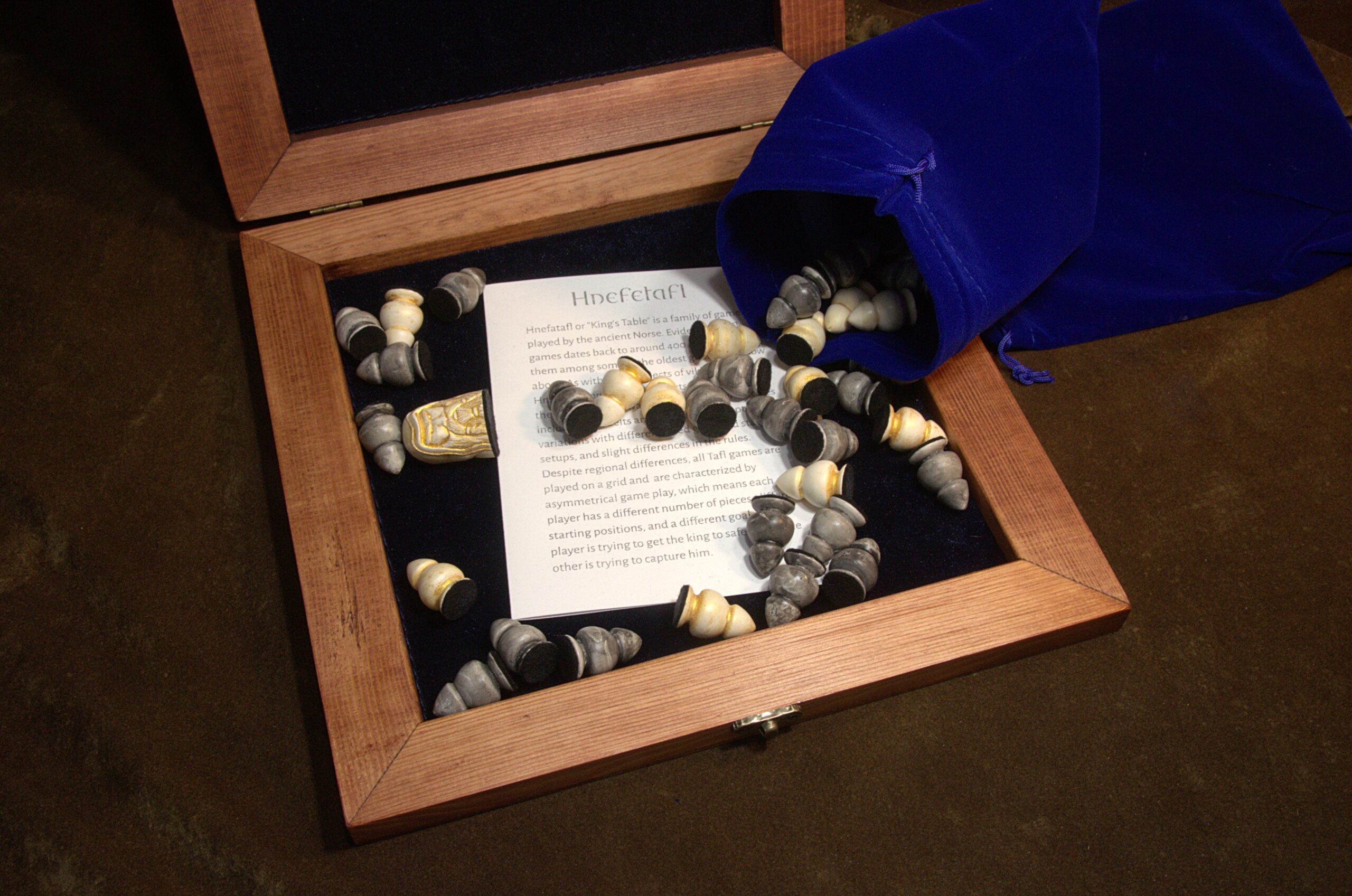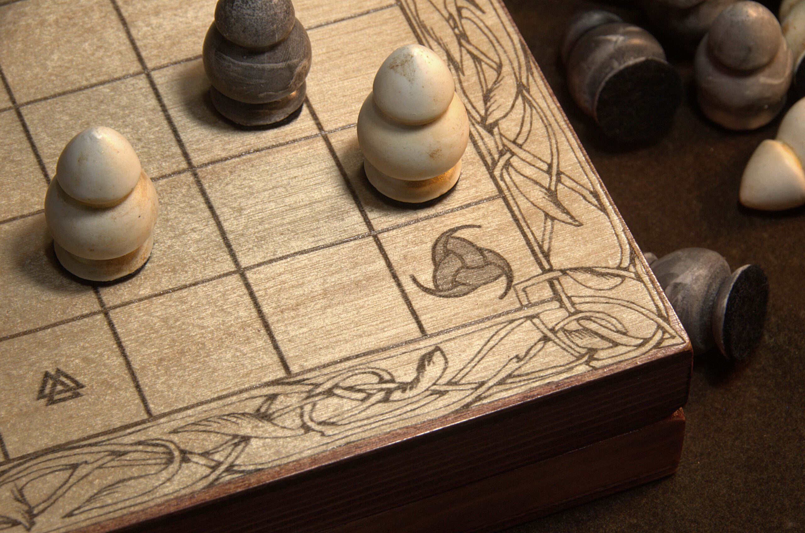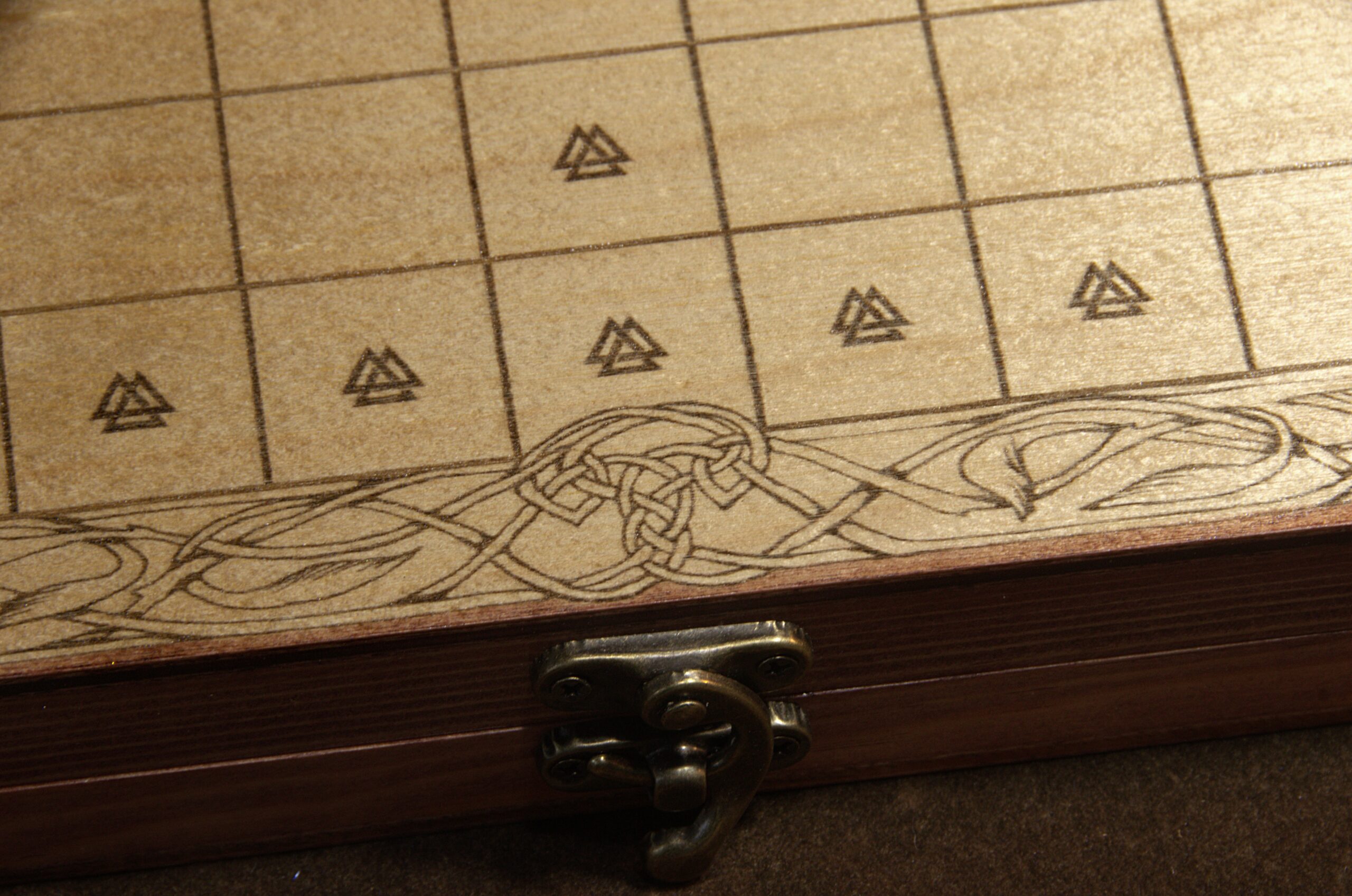 The game board is engraved onto a 12″x12″ wooden box, engravings of ancient Norse symbols (valknut and triple horn) mark the important spaces on the board. The boarder is from an original ink drawing that I digitized then laser engraved onto the wood. The inside of the box is lined with velour and includes a velvet bag to hold the pieces secure while they’re inside. You may optionally add bronze feet to turn your game into an elegant display piece to feature on your shelf or coffee table.