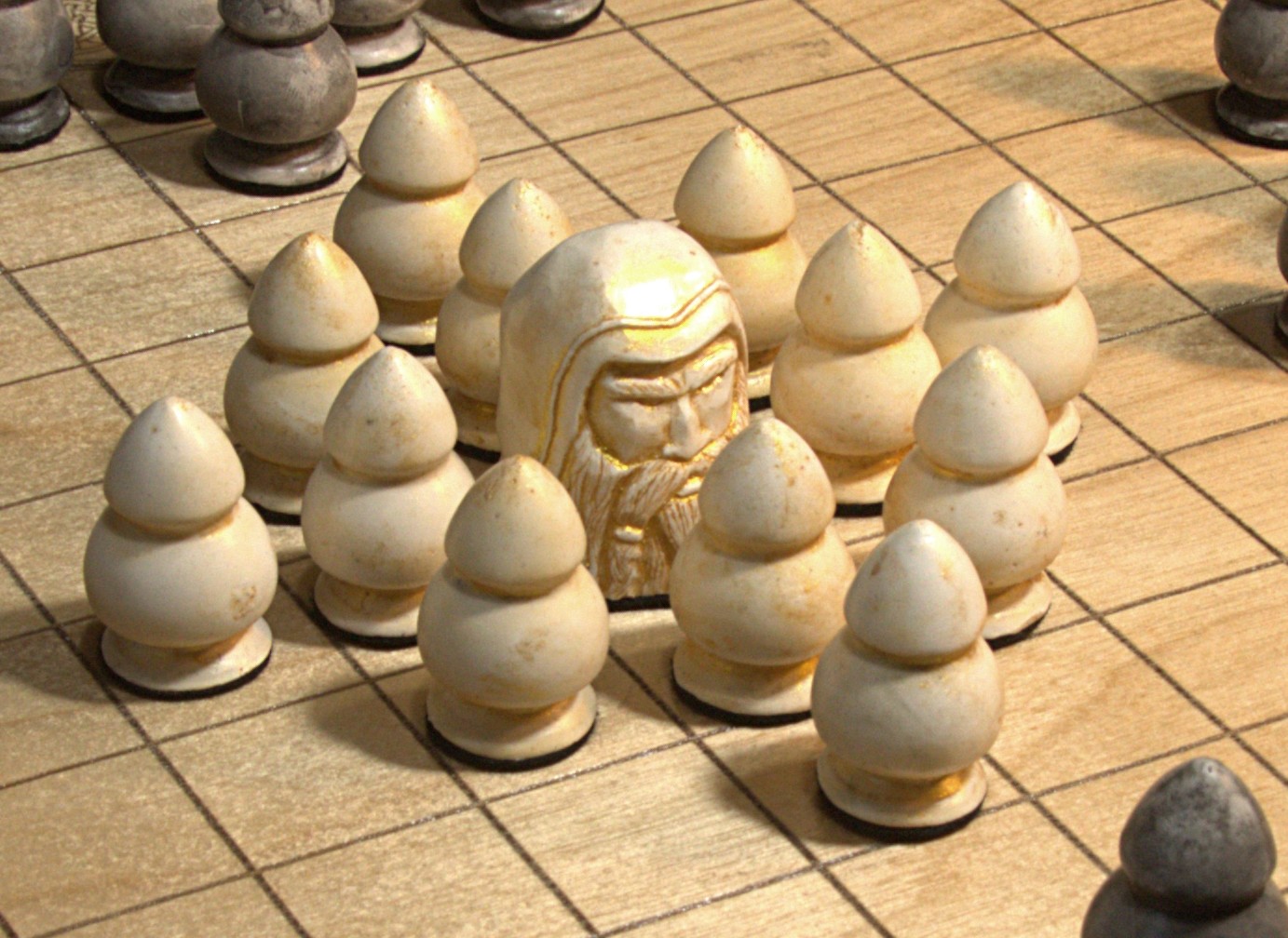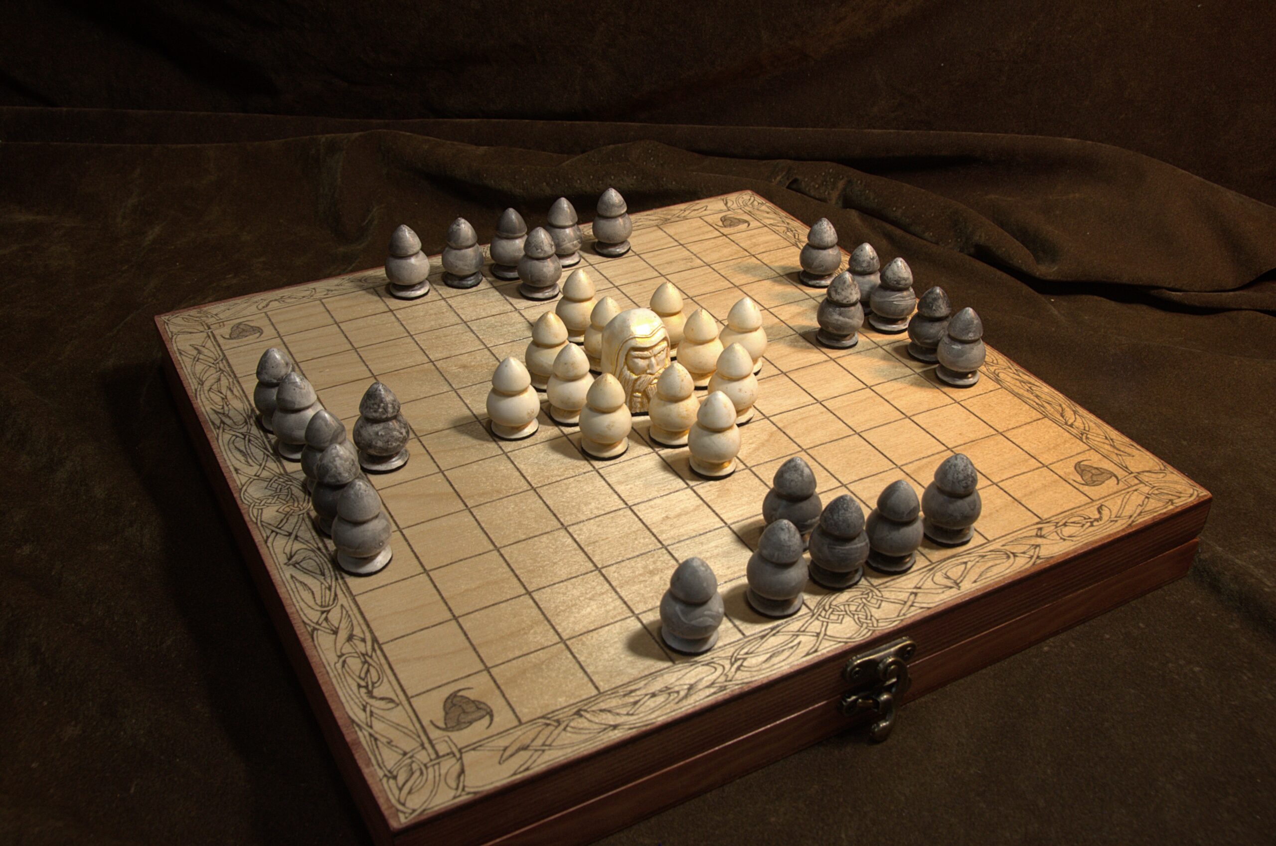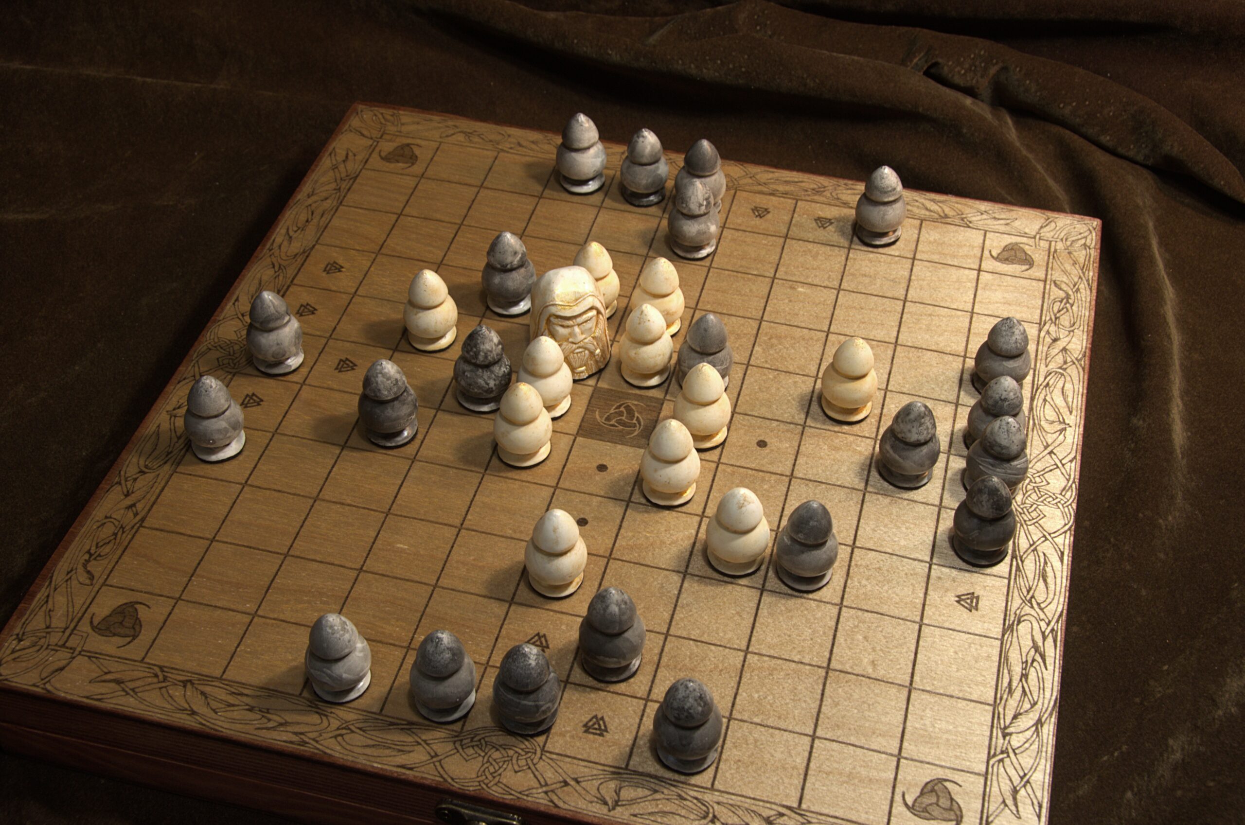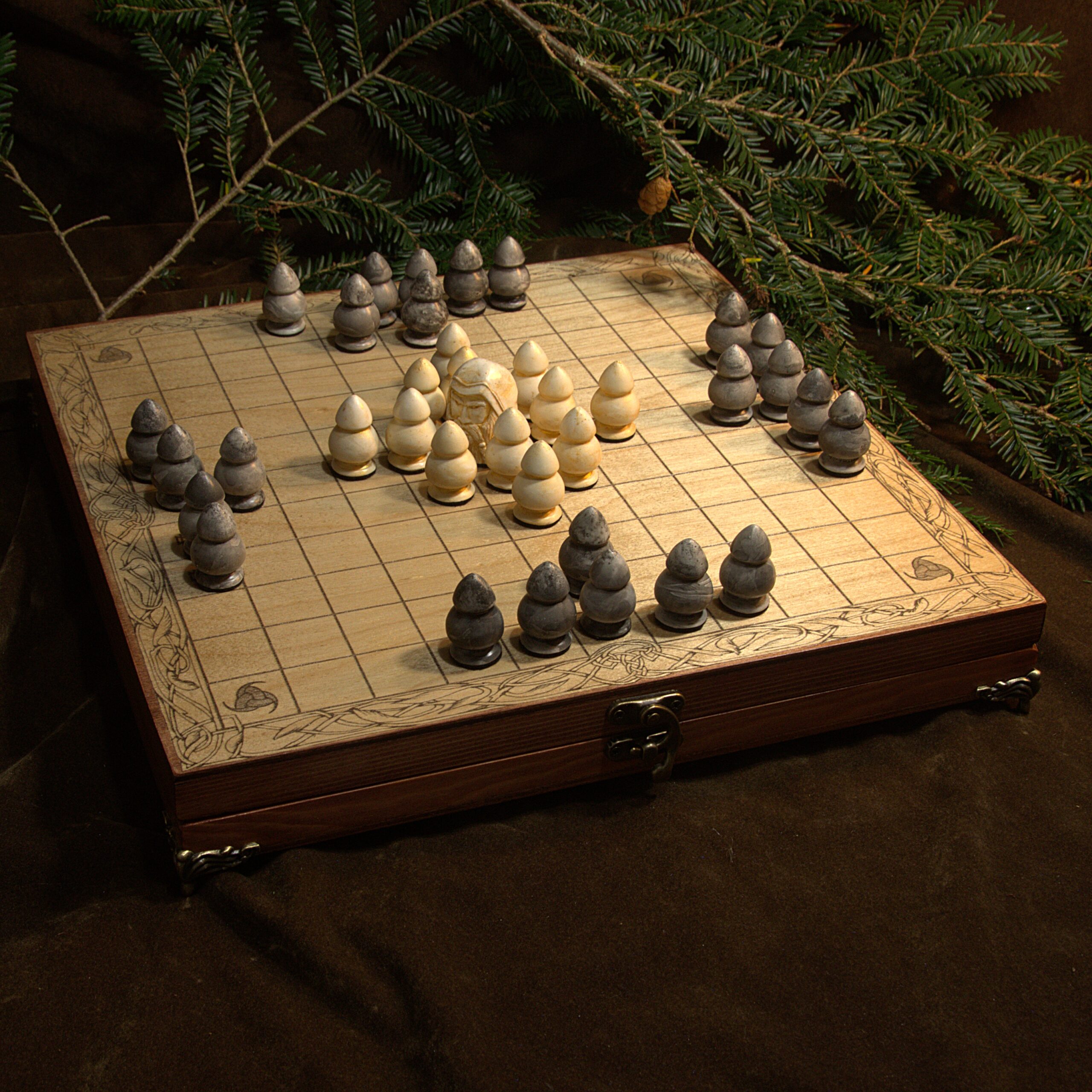 Hnefatafl or “King’s Table” is a family of games played by the Norse people in ancient times. Evidence of tafl games dates back to around 400 AD which puts them among some of the oldest games we know about. Many variations of tafl games existed throughout Europe, as it was often enjoyed by the Vikings who brought board games with them to pass the time on their long journeys. This version with an 11×11 grid is also known as Copenhagen Hnefatafl to distinguish it from other versions.