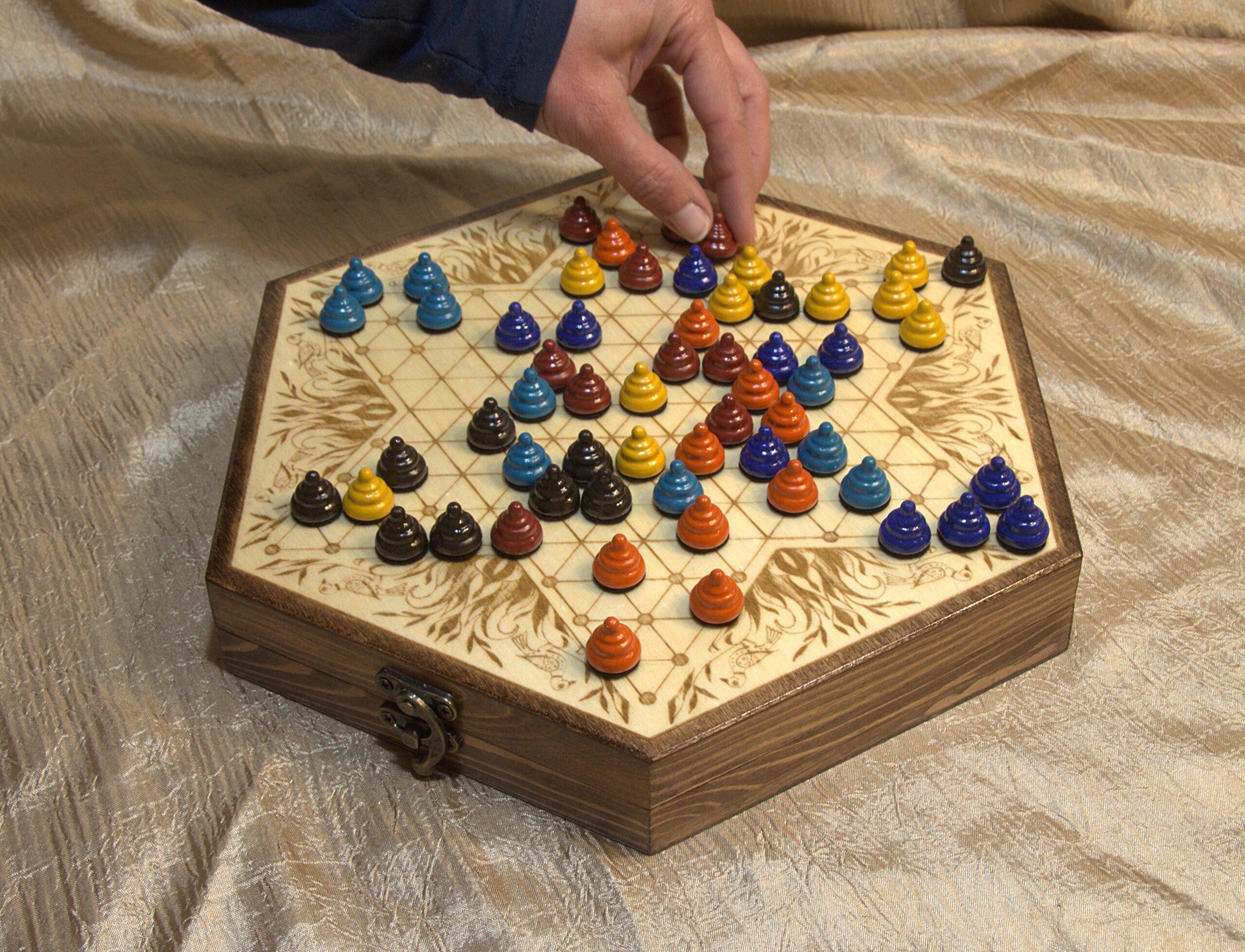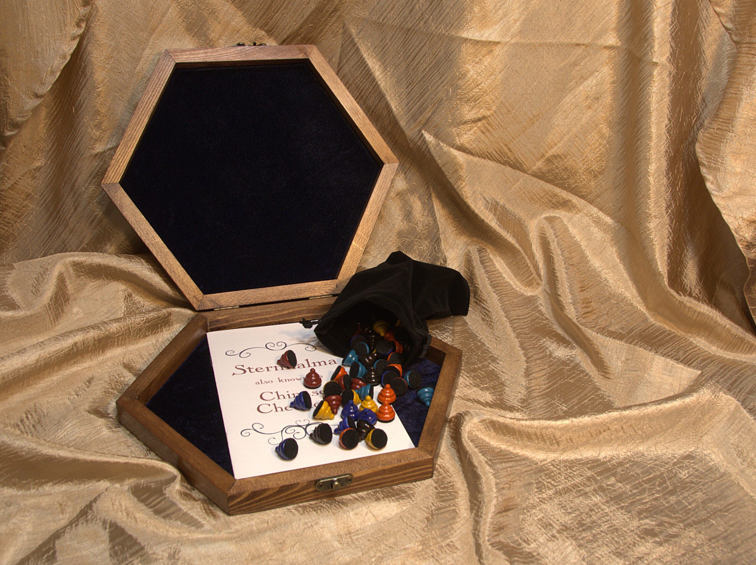 What’s included: 10 inch wooden game board/box, 60 handcrafted playing pieces (10 of each color), and printed booklet with history and instructions for the game.