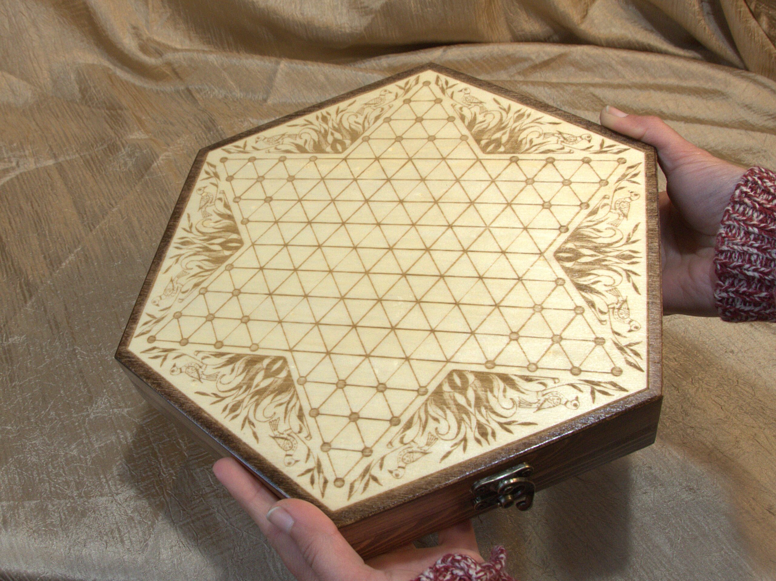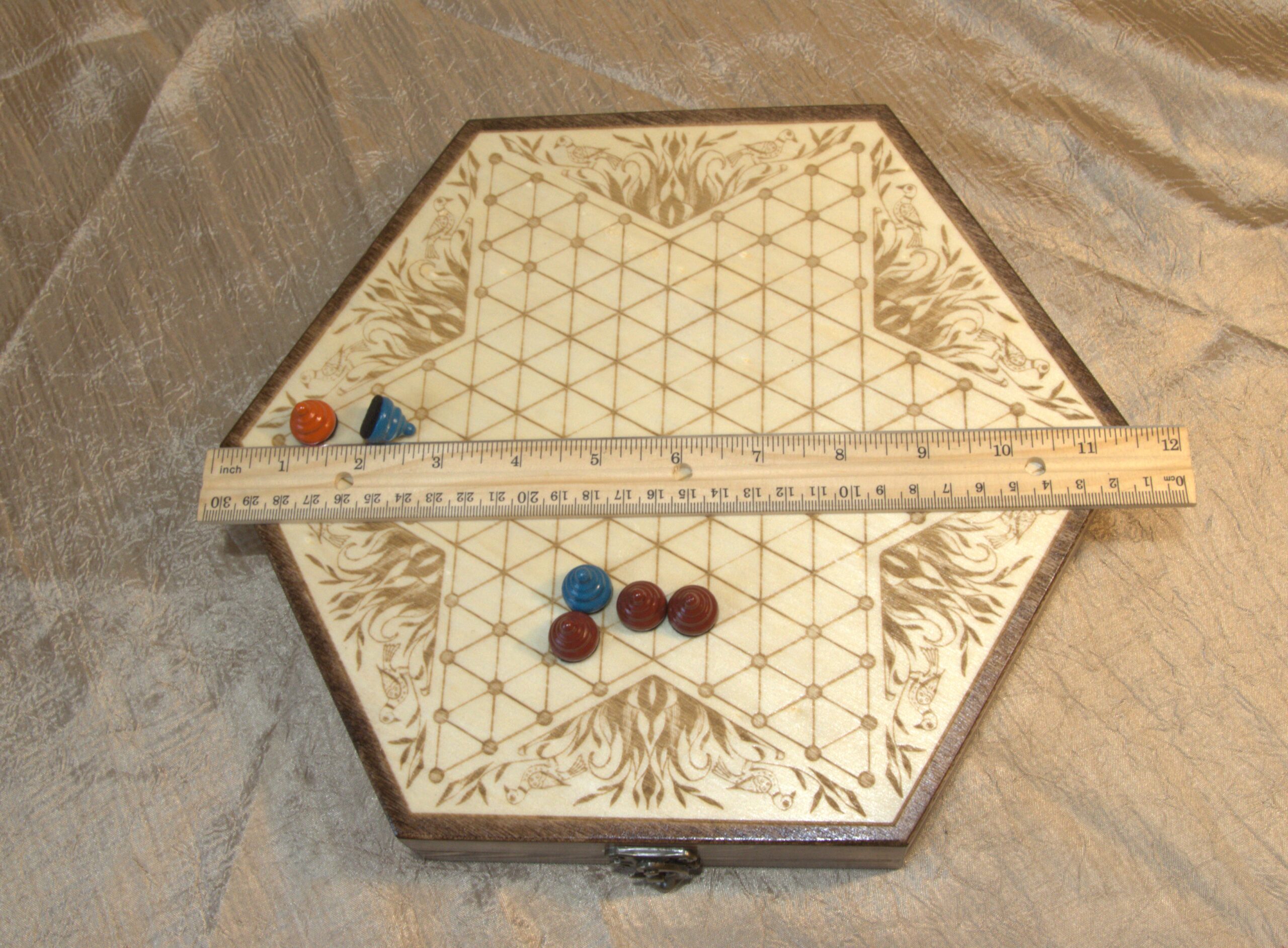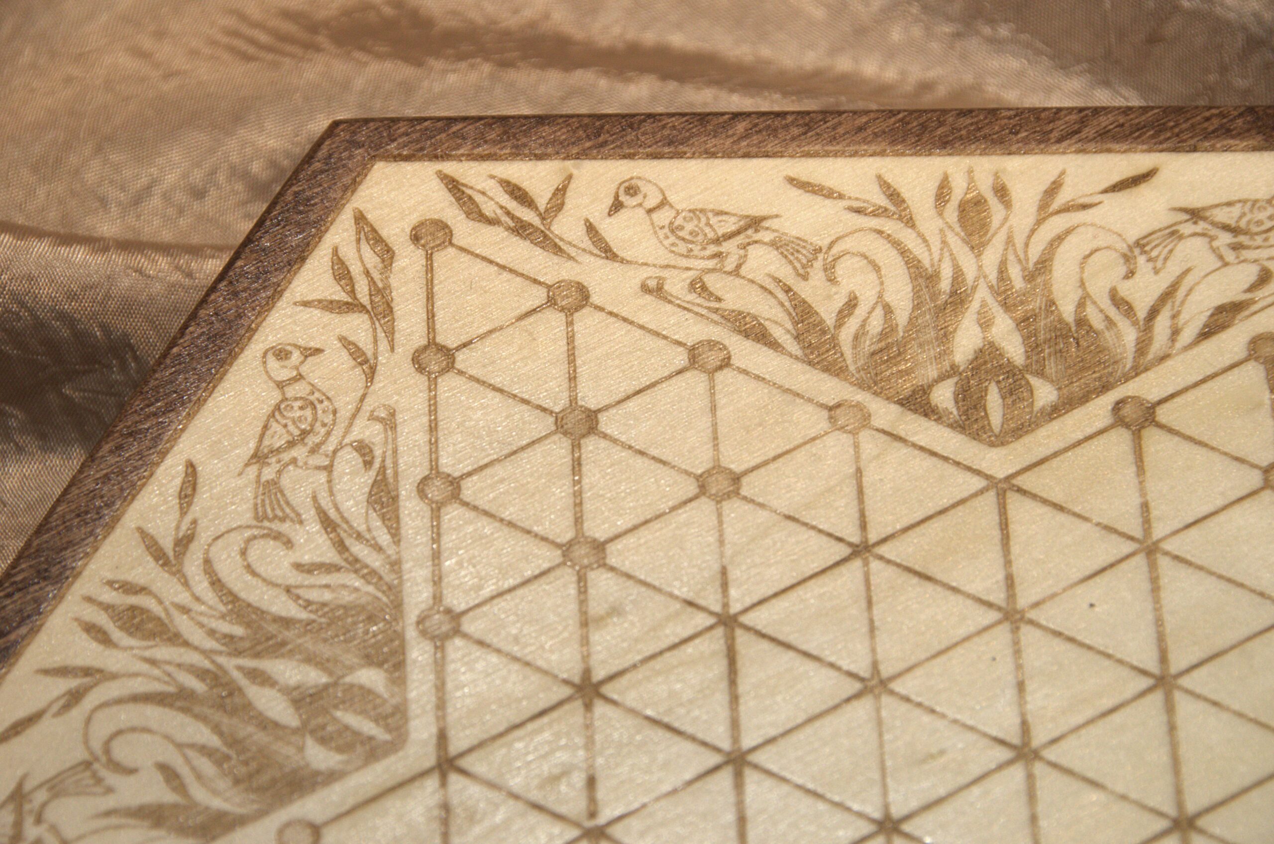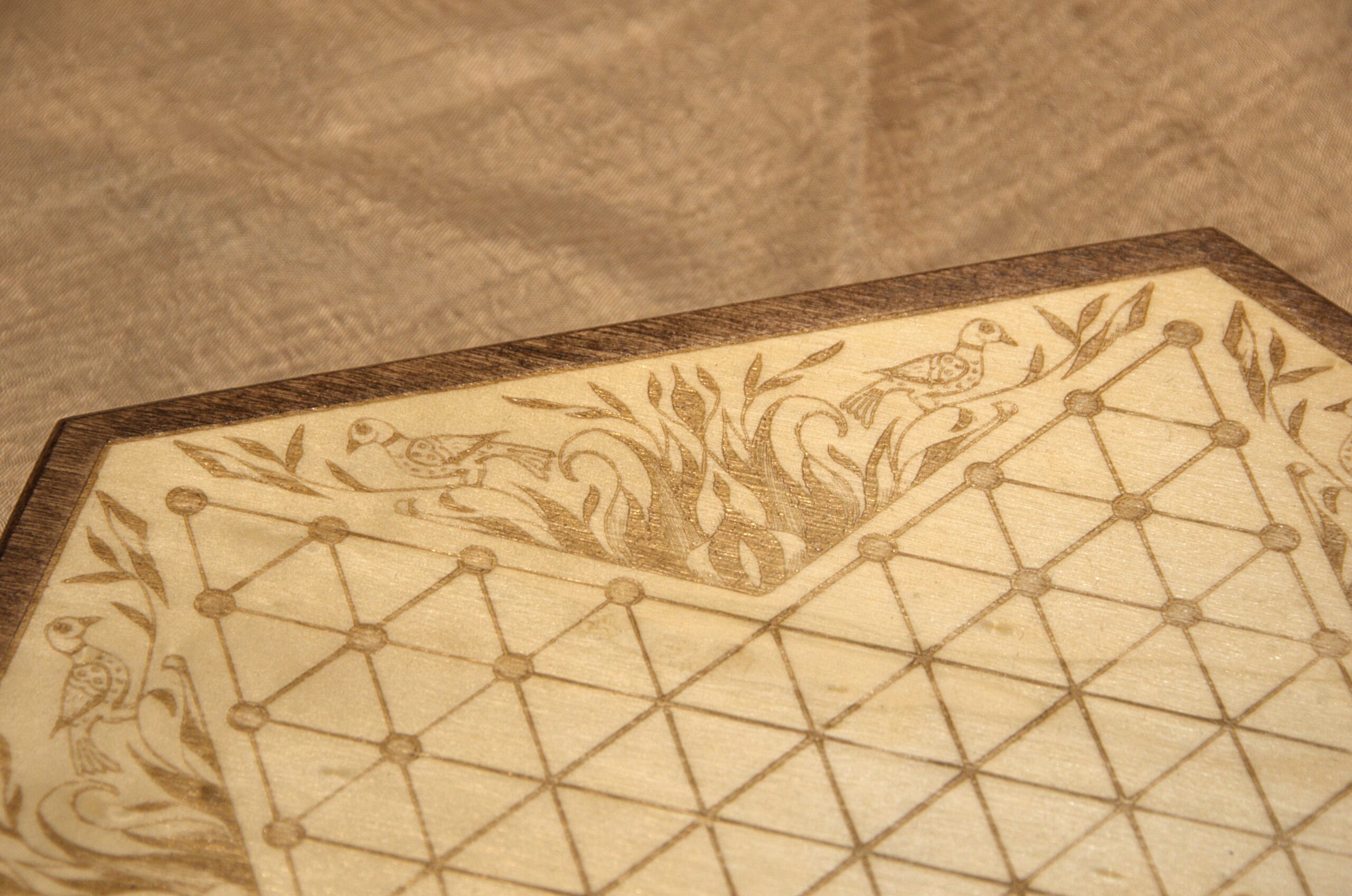 This game board is engraved onto the top of a 10 inch wooden hexagonal box. The decorative embellishment is one of my own drawings based on the “Fraktur” art style, which was popular among German-Americans during the time this game was invented.