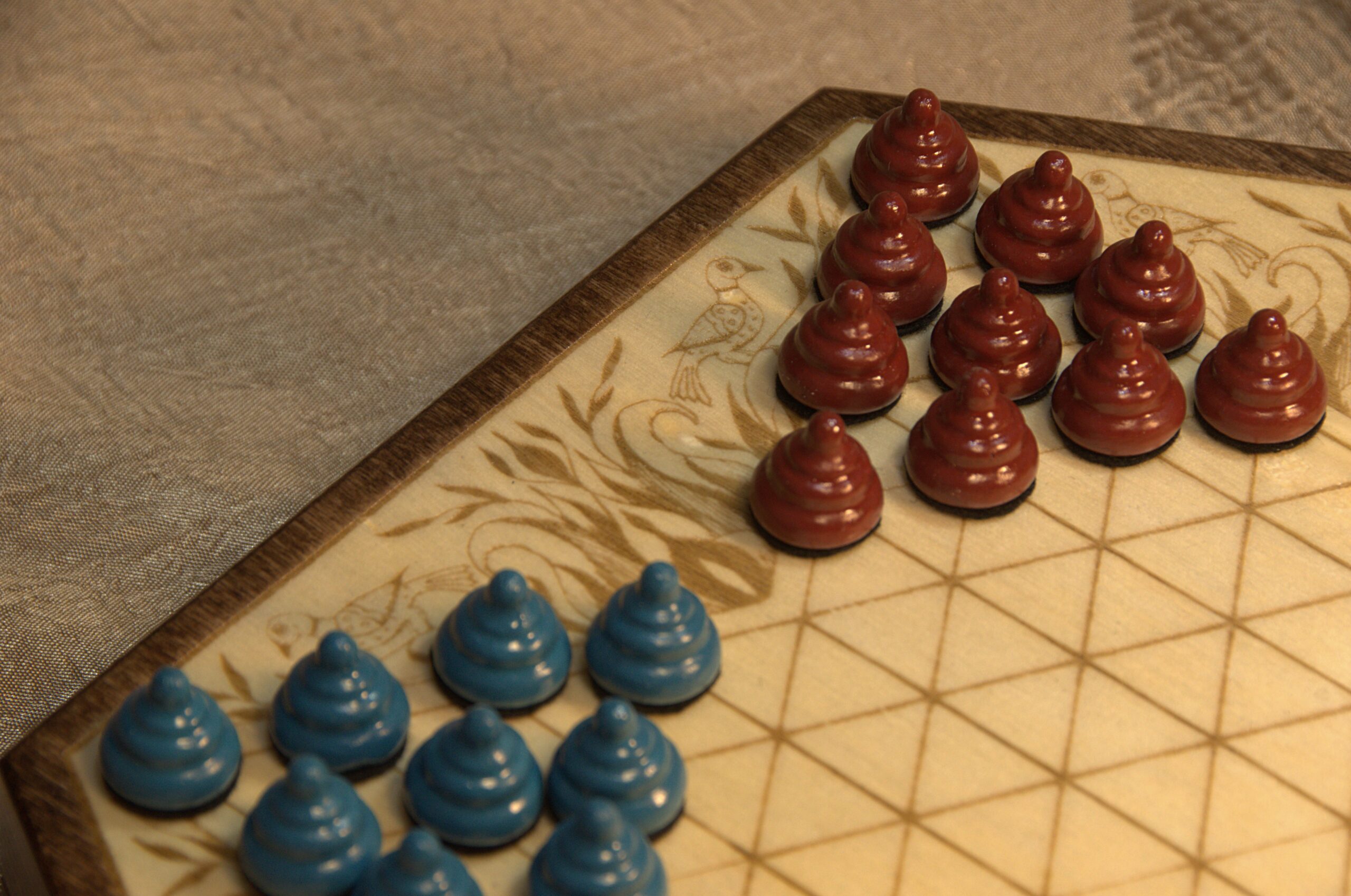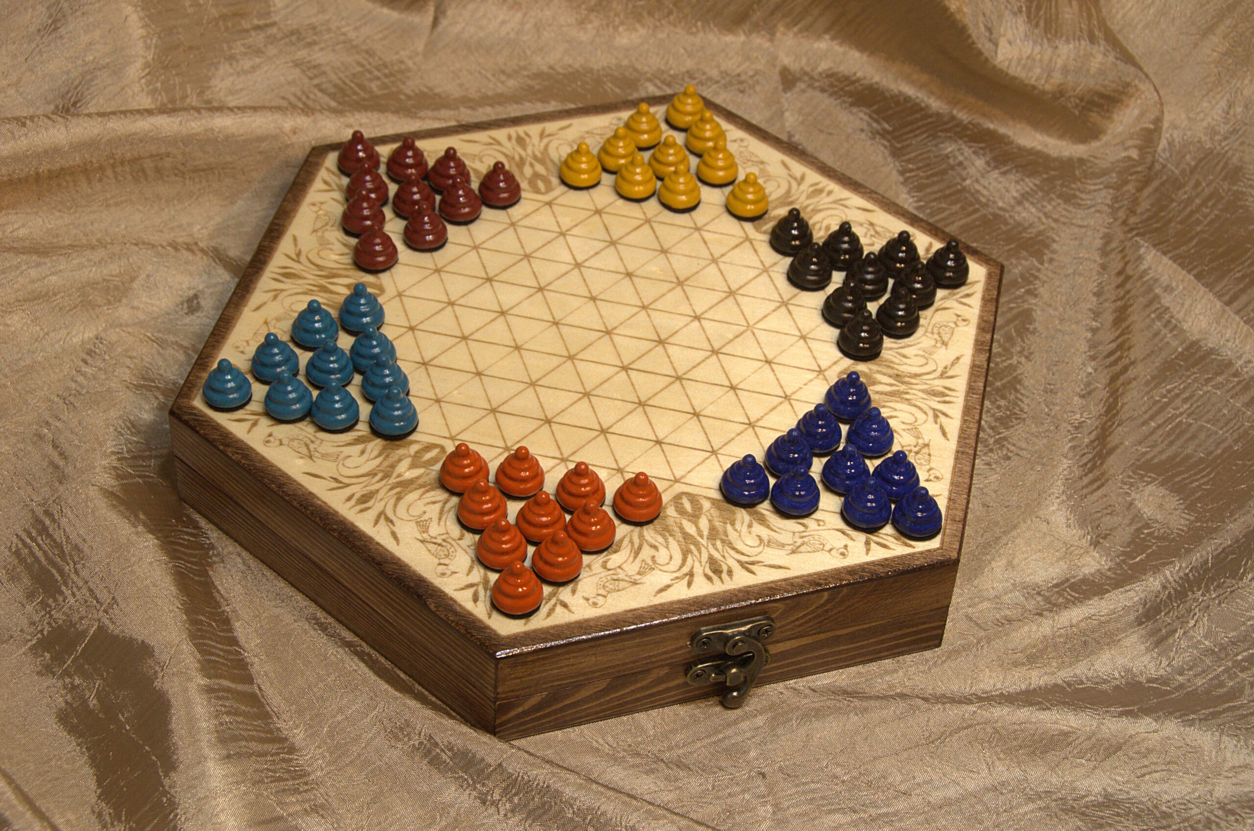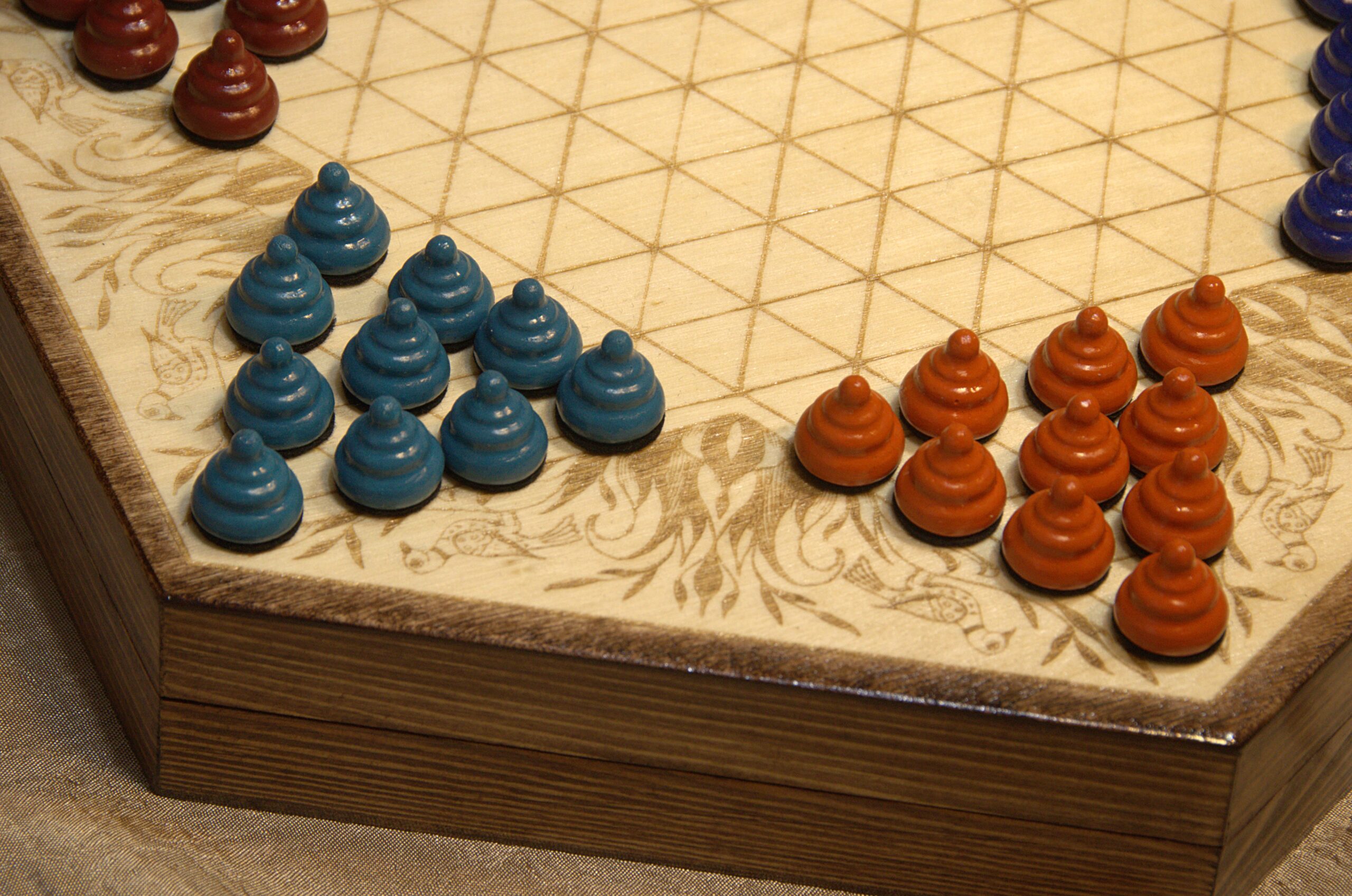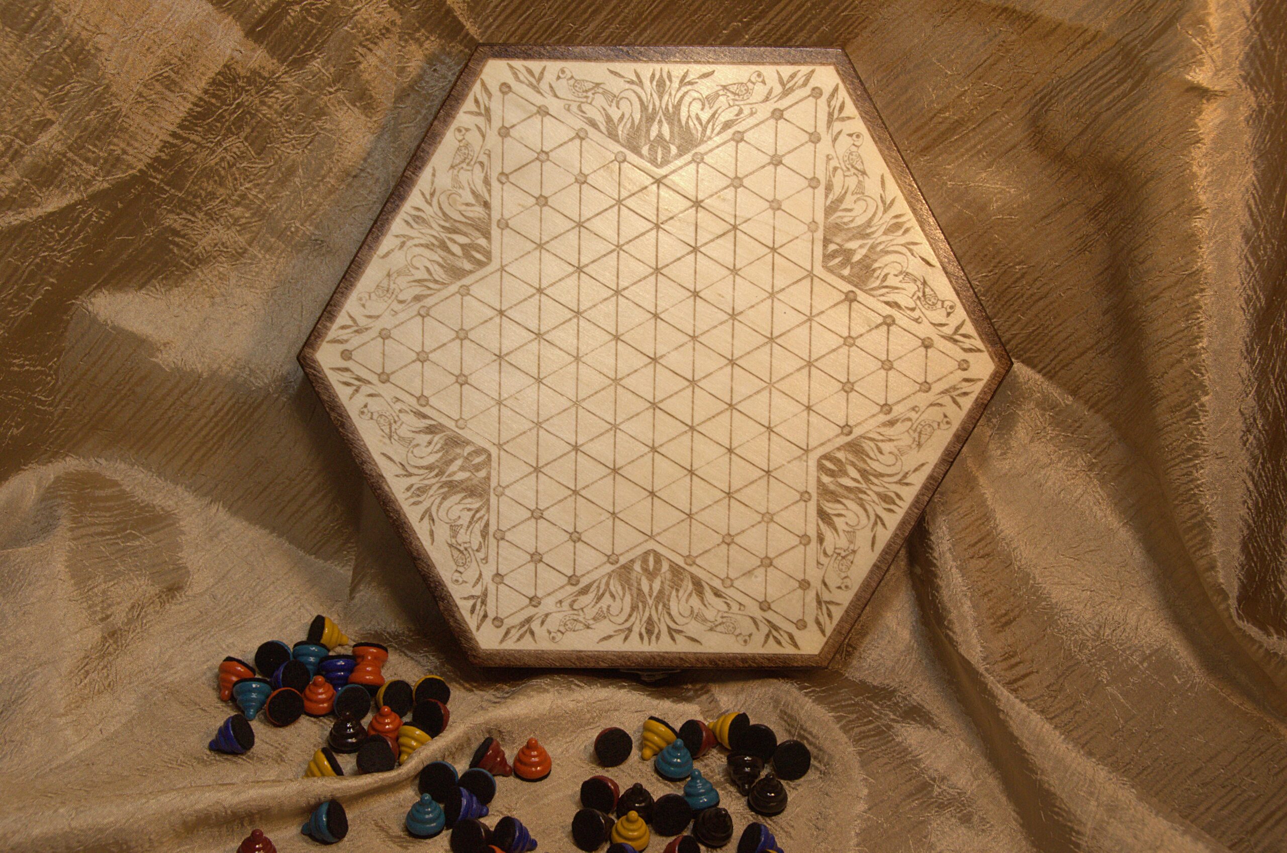 This game board is engraved onto the top of a 10 inch wooden hexagonal box. The decorative embellishment is one of my own drawings based on the “Fraktur” art style, which was popular among German-Americans during the time this game was invented.