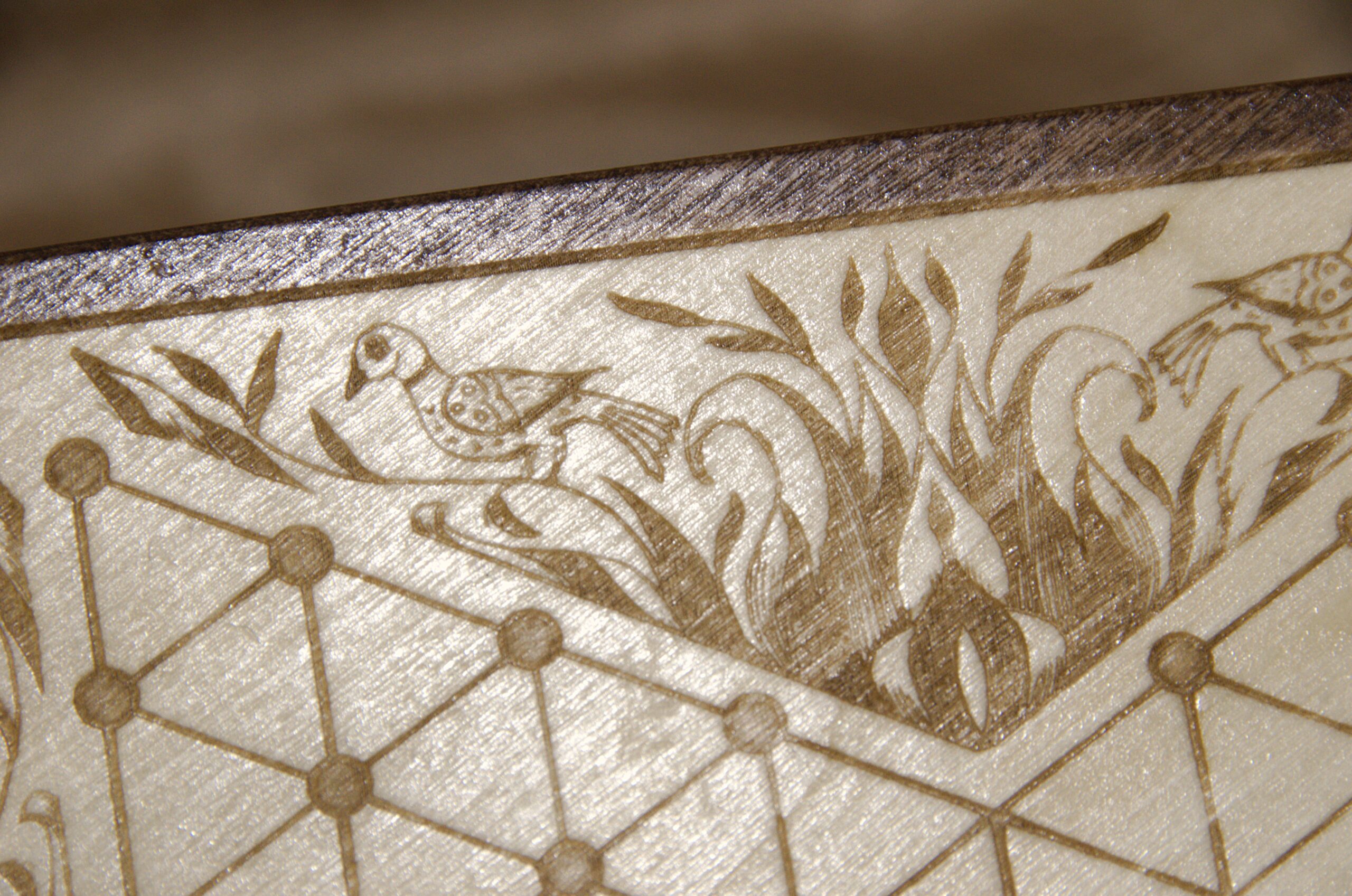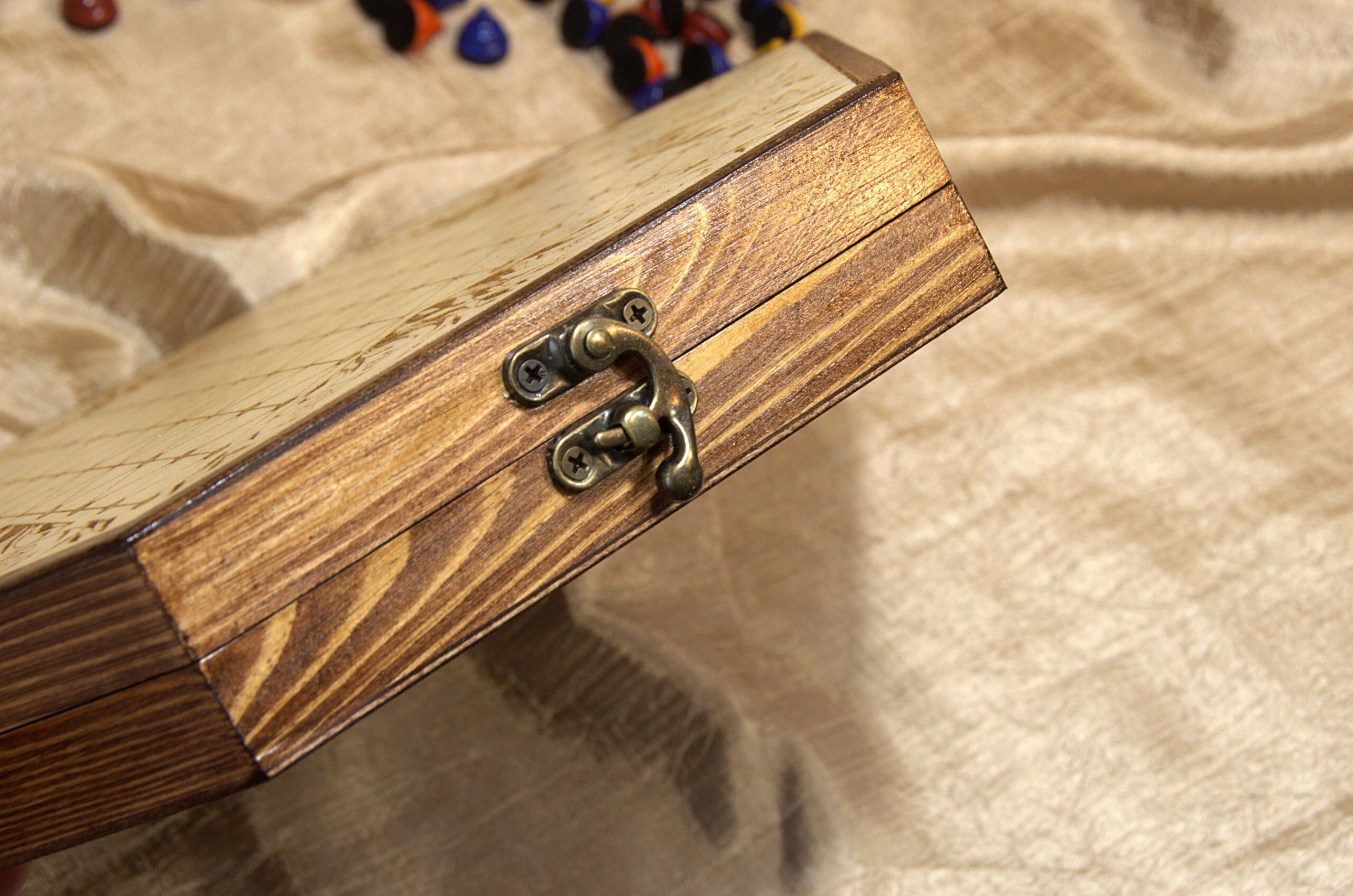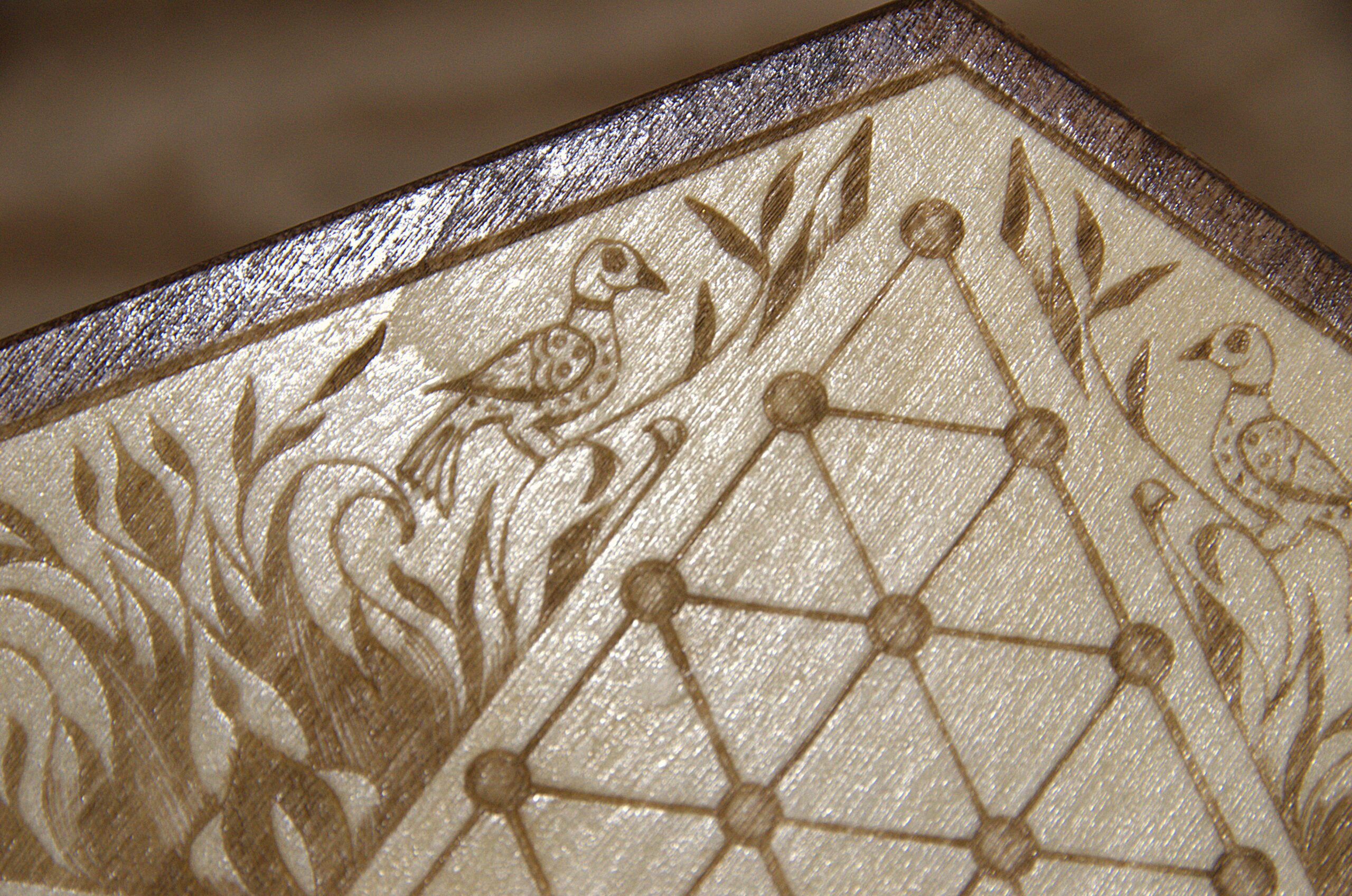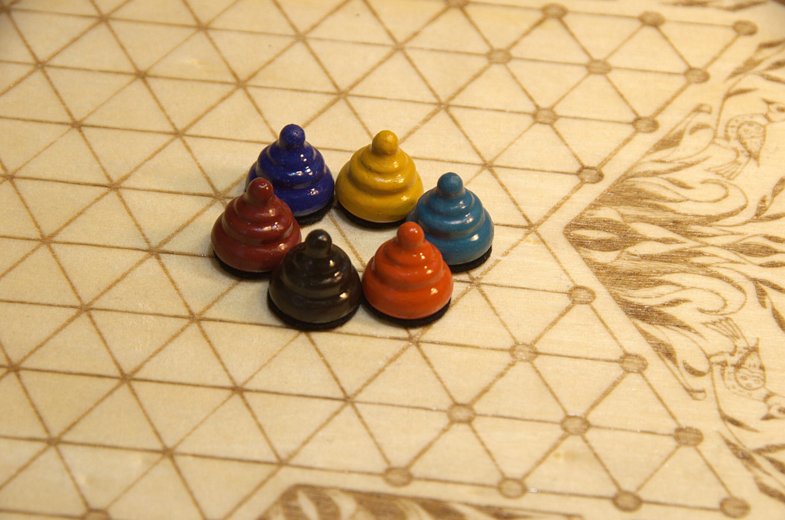 This game board is engraved onto the top of a 10 inch wooden hexagonal box. The decorative embellishment is one of my own drawings based on the “Fraktur” art style, which was popular among German-Americans during the time this game was invented.